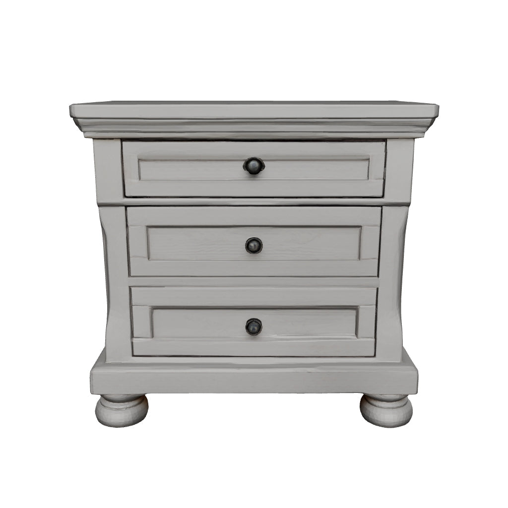 Elegant, timeless furnishings take your bedroom to the next level. Nothing does that better than this nightstand. The antiqued white finish with a wonderful grain texture radiates sophistication, while the dark bronze-tone hardware adds an ornate touch. A hidden pull-out tray behind the bottom drawer puts your small valuables out of sight. Felt finishing in the top drawer and a hidden pull-out tray rounds out the piece for the ultimate tasteful bedroom.