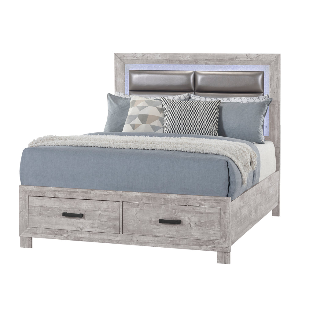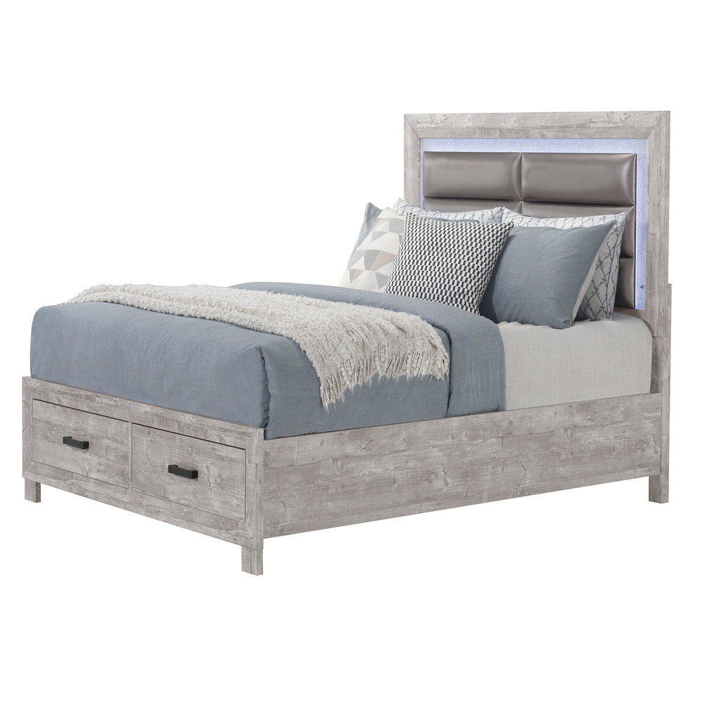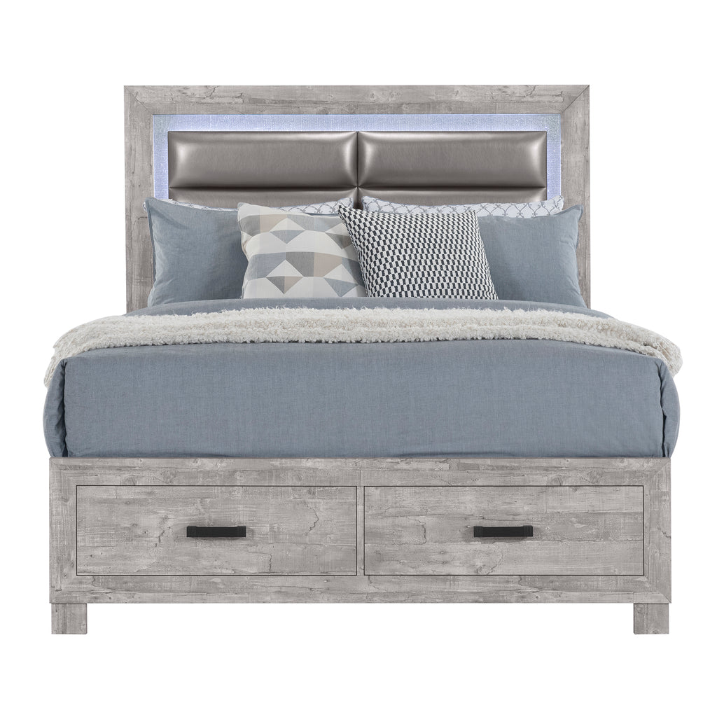 Embrace farmhouse charm with this elegant light gray bed, crafted from solid wood and MDF for lasting quality. Discover ultimate convenience with a sleek 2-drawer footboard offering clever storage solutions. Enjoy superior comfort thanks to the plush padded headboard, perfect for any stylish bedroom sanctuary.