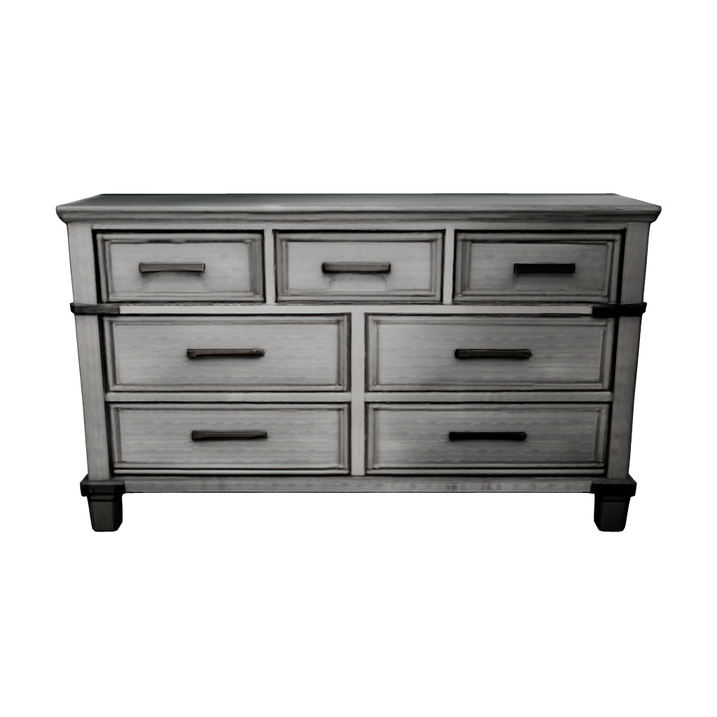 What's old is what's new with this dresser. Serving up a fresh look in urban farmhouse style, this eclectic piece features a light weathered gray finish with dark aged bronze-tone accents and metal straps for a casually cool sensibility. Profiled drawer frames, thick-profiled top moulding and tapered legs are the earmarks of timeless design.
