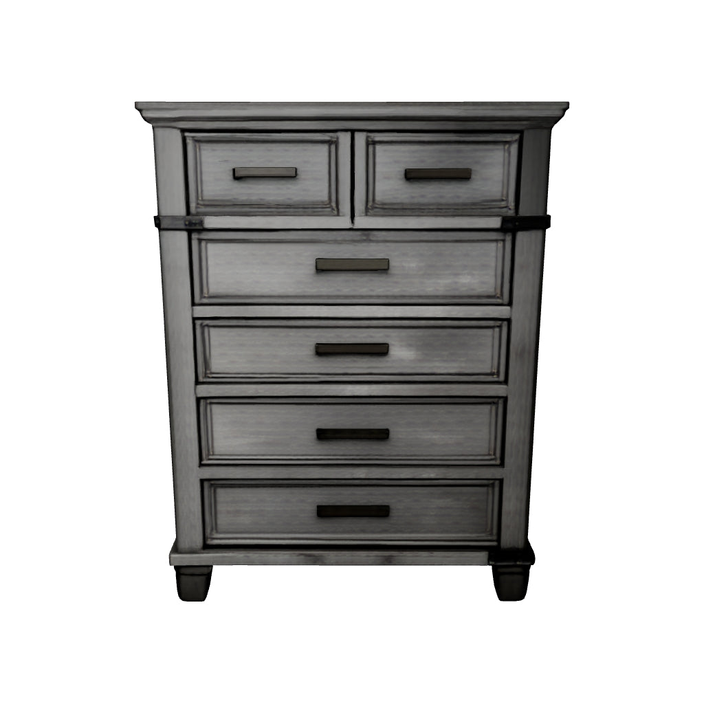 What's old is what's new with this chest. Serving up a fresh look in urban farmhouse style, the eclectic piece features a light weathered gray finish with dark aged bronze-tone bar pulls and metal straps for a casually cool sensibility. Profiled drawer frames, thick-profiled top moulding and tapered legs are the earmarks of timeless design.