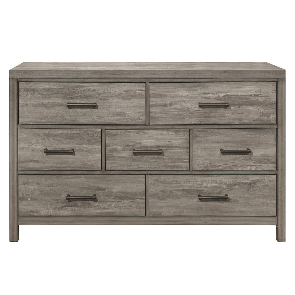 Following the trend of rusticated simplicity is the Bainbridge Collection. Melamine laminate perfectly mimics the look of weathered gray wood, lending to the rustic style. The transitional framing of the dresser allows for placement in myriad bedroom settings, creating the perfect canvas for your preferred decorative style. Black metal bar hardware fronts the drawers, providing complementing contrast to the gray finish.