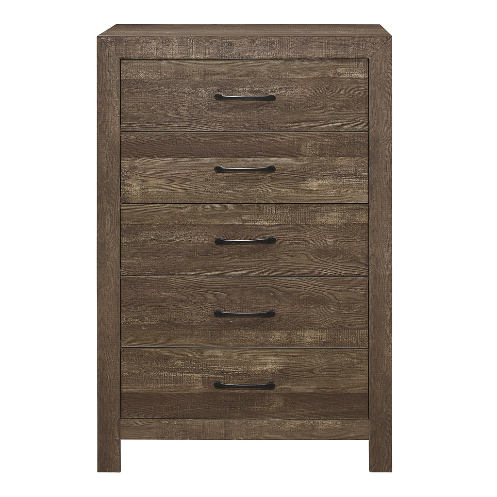 Modern lines and rustic styling are paired to create the look of the Corbin Collection. The embossed faux-wood veneers texture is highlighted by a rustic brown finish for a realistic wood look. Providing complementing contrast, the drawer fronts of the chest feature black metal hardware. Subtle framing defines the profile of the chest, further lending to the unfettered design of the collection.
