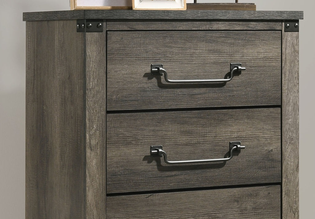 Rustic farmhouse styling with a Rustic Gray finish that brings a charming, weathered look to your space. Crafted from melamine paper, engineered wood, rubberwood, and metal—a blend that balances durability with visual appeal. Features English dovetail drawer construction, enhancing strength and longevity. Equipped with center metal glides for smooth drawer operation. Finished with antique brass color drop handles, adding a vintage accent