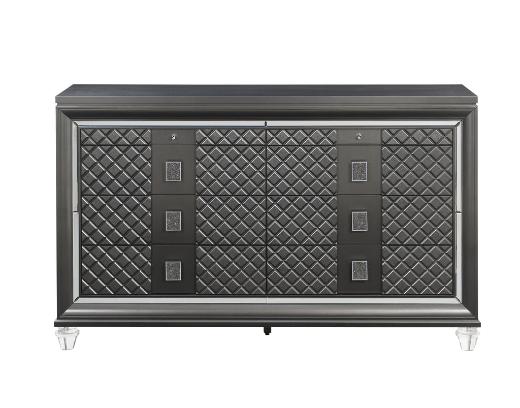 - This exquisite dresser combines both sophistication and functionality, featuring eight spacious drawers, including two dedicated jewelry drawers for the safe storage of precious items. The drawers are beautifully designed with sparkling trim and embossed fronts, adding a luxurious, textured look to the piece.