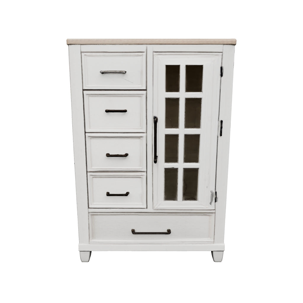 This door chest elevates the art of modern farmhouse design. Its two-tone aesthetic blends antiqued white and light grayish brown for a charming finish. Framed drawer fronts and a windowpane door lend a country feel. Conveying a feeling of relaxed comfort, the chest is sure to carry you away to a dreamy time and place.