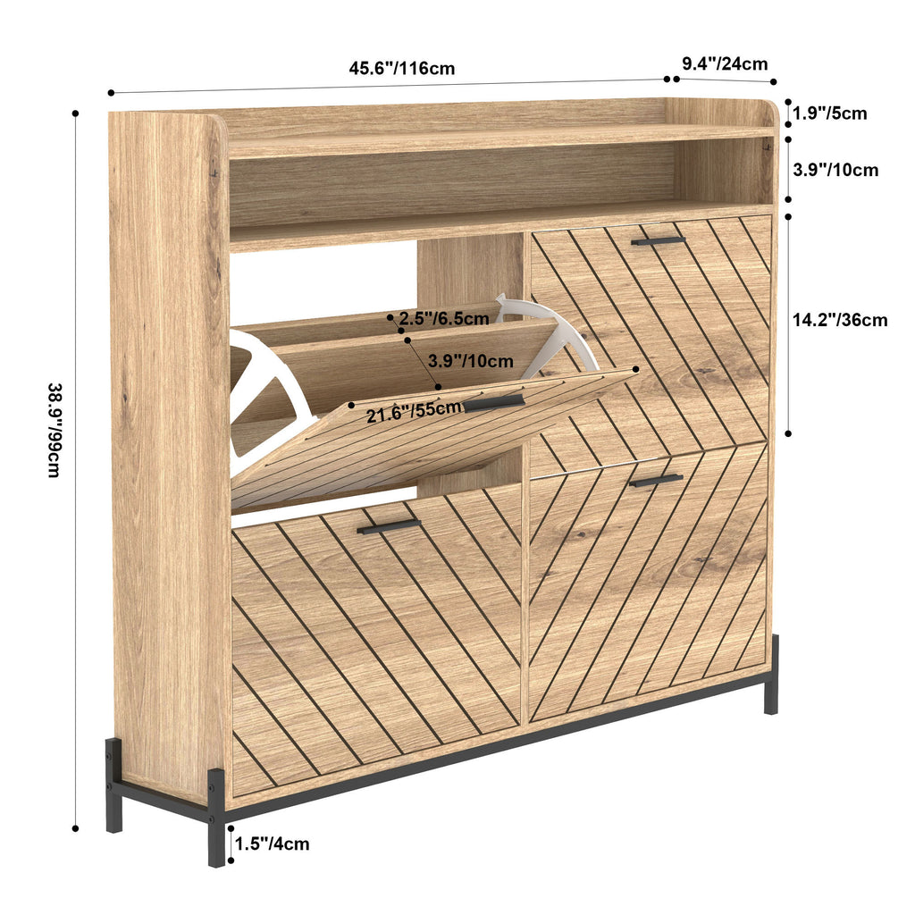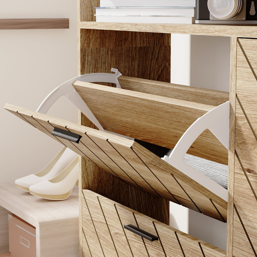 - This shoe cabinet is perfect for your entryway, hallway, living room, or porch. With 4 flip doors, it provides hidden storage for your shoes while maintaining a modern and rustic design. The carved arrow detailing in rustic light brown and white gold complements any home style. Keep your home neat and save space with this stylish shoe cabinet.