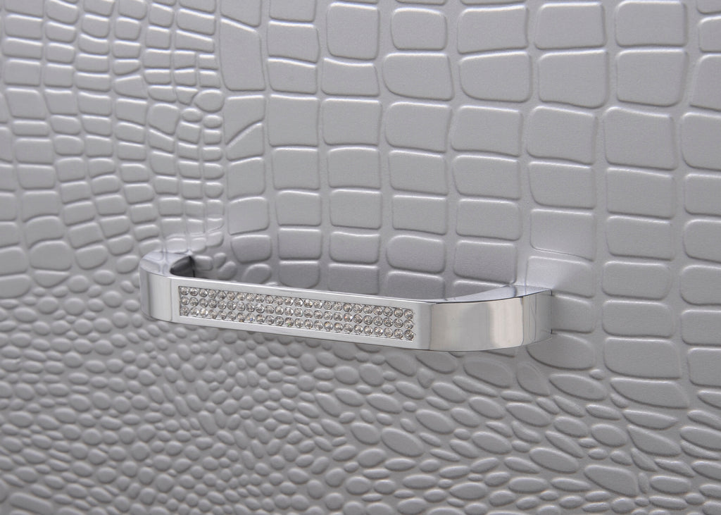 This charming chest of drawers features glittering details such as faux crystal hardware and a beveled mirror accent. Adding to the glamorous design is a silver crocodile skin design. Not just nice to look at, the chest has five drawers sturdily constructed with English dovetail joinery.
