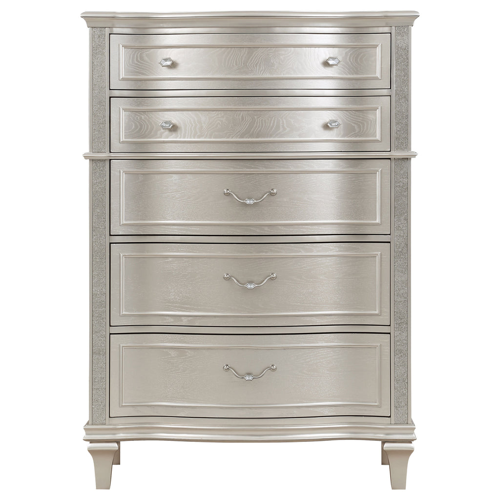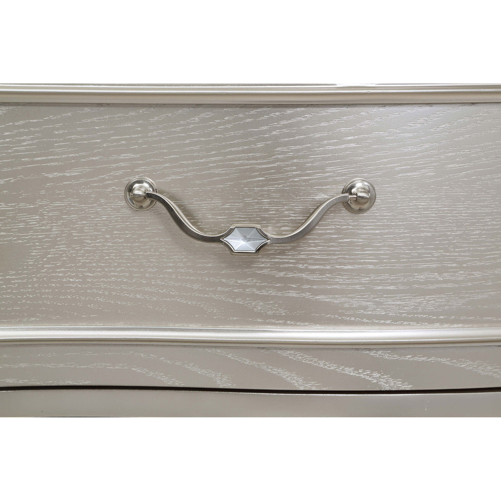 Make the most of limited floor space in your glamorous bedroom with this contemporary silver oak chest, designed with five spacious drawers appointed with gleaming hexagonal knobs and pearlescent accented drop pulls. Turned feet mirror the contoured silhouette of this chic chest of drawers, bursting with luxe details seen in the sparkling acrylic side panels and timeless crown molding and wood trim details.
