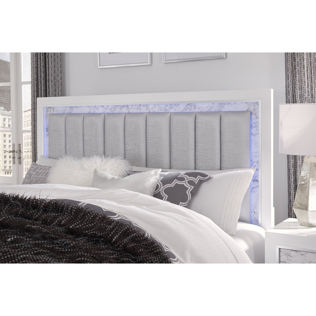 Elevate your bedroom with this modern King Panel Bed, featuring a chic LED-lit and padded headboard for ultimate comfort and style. Crafted from durable solid rubberwood, its clean white finish and upholstered accents add a touch of sophisticated elegance. Experience luxury and contemporary design in one exquisite bedroom centerpiece.