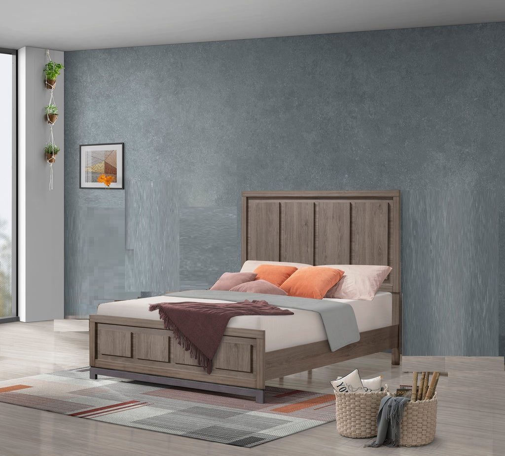 Elevate your bedroom with this King-size contemporary wood bed frame, meticulously crafted in Malaysia with a sleek linear design. Its rich grey oak finish and modern style create a tranquil yet sophisticated centerpiece for any bedroom. Enjoy lasting quality and timeless elegance, perfectly suited for a box spring to complete your luxurious sleep sanctuary.