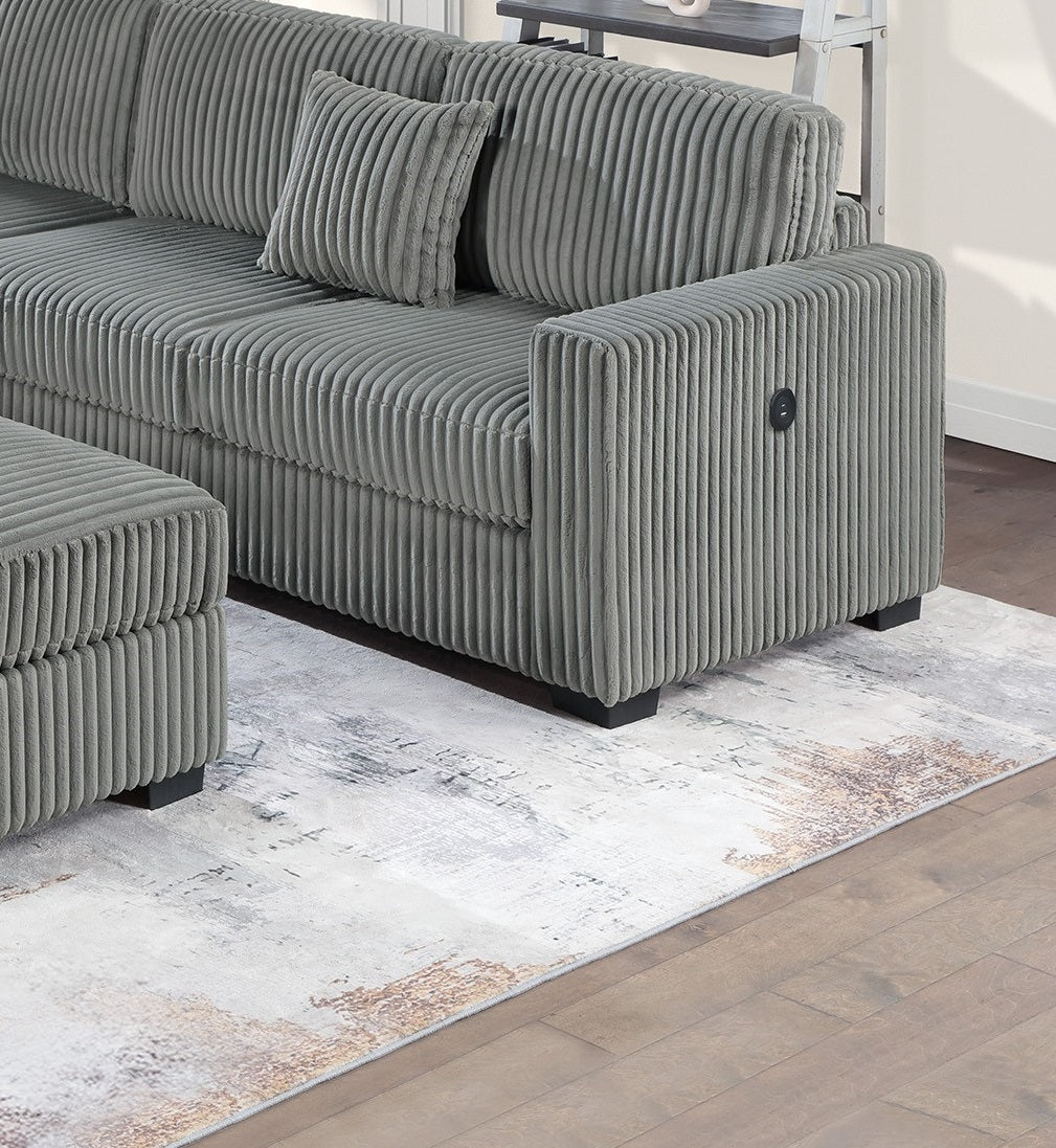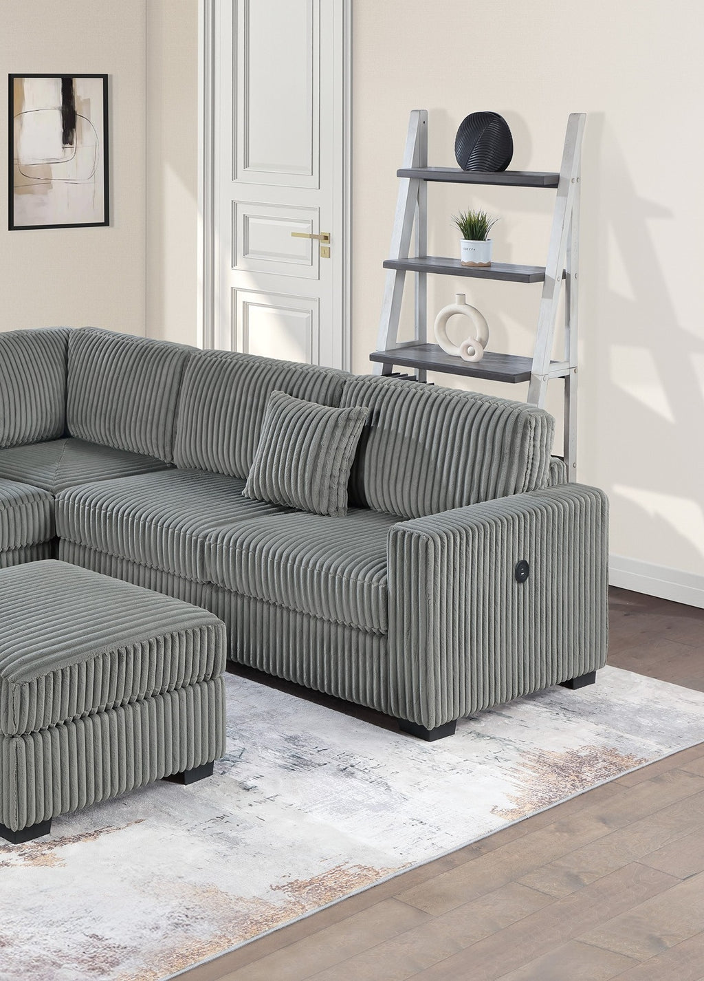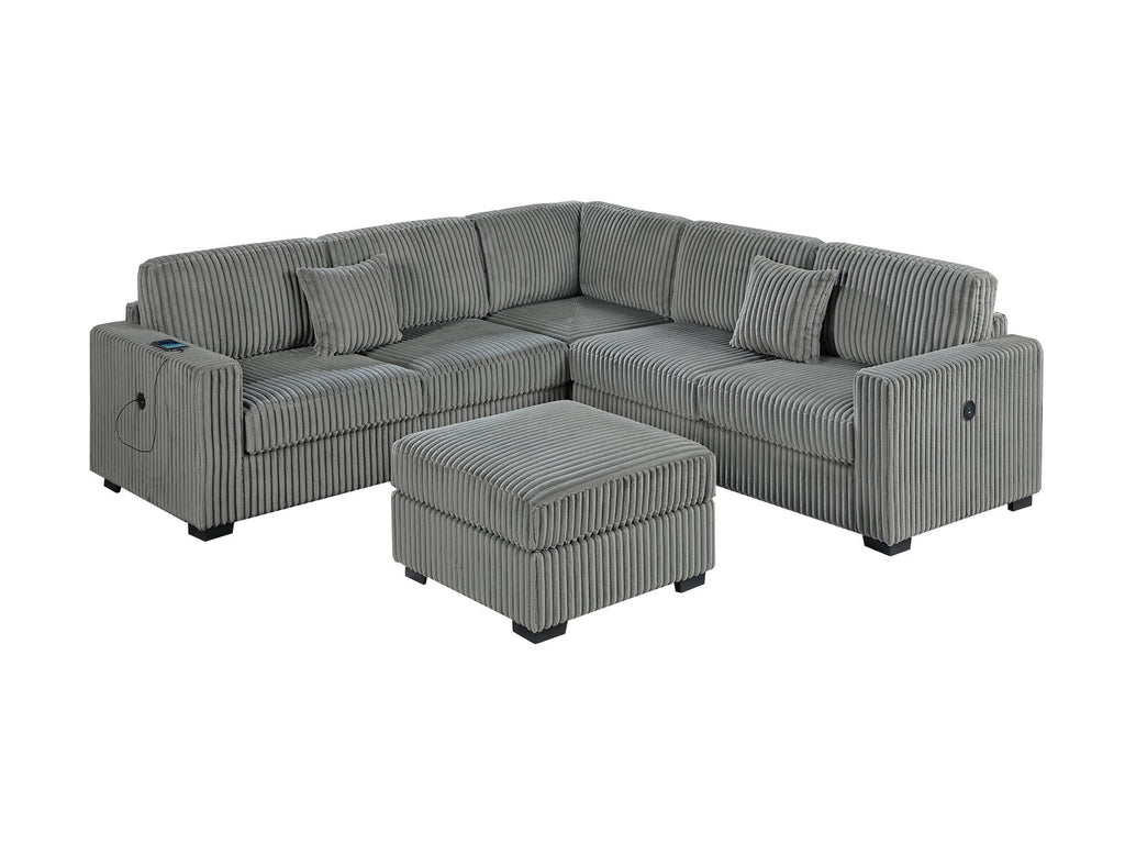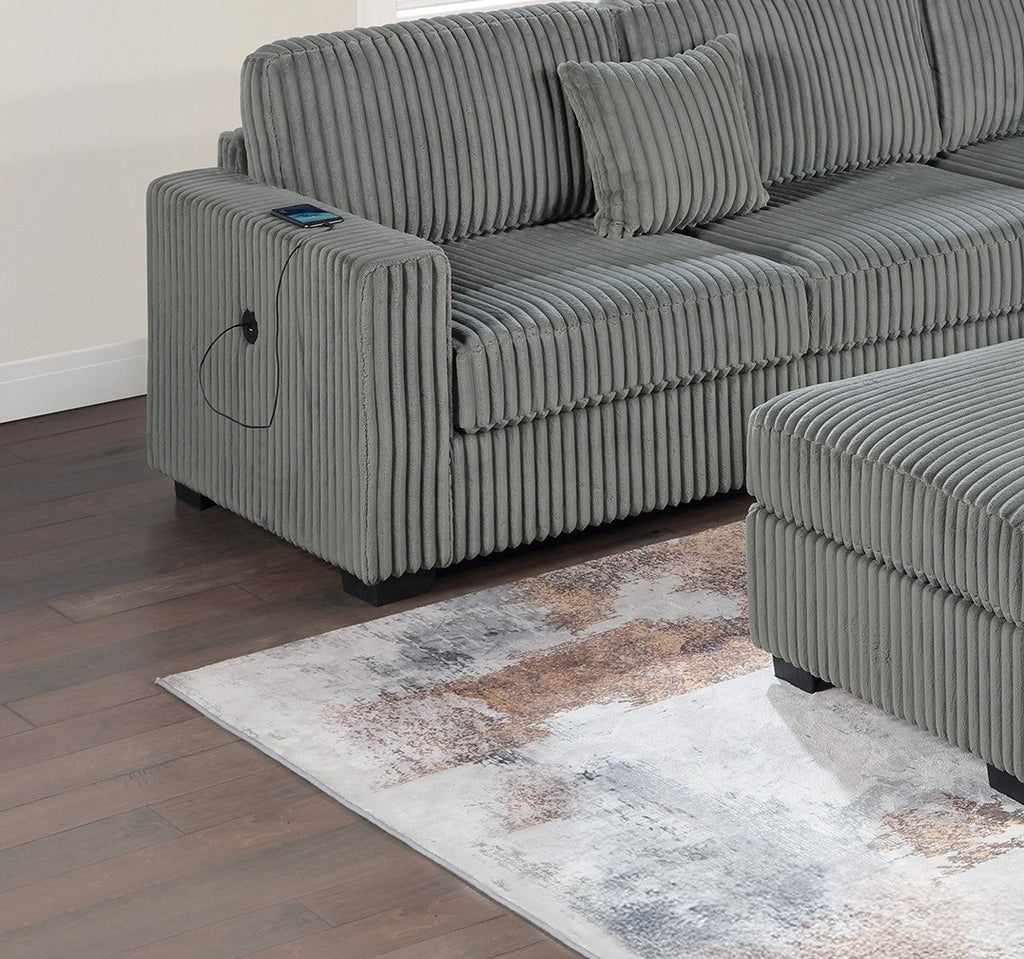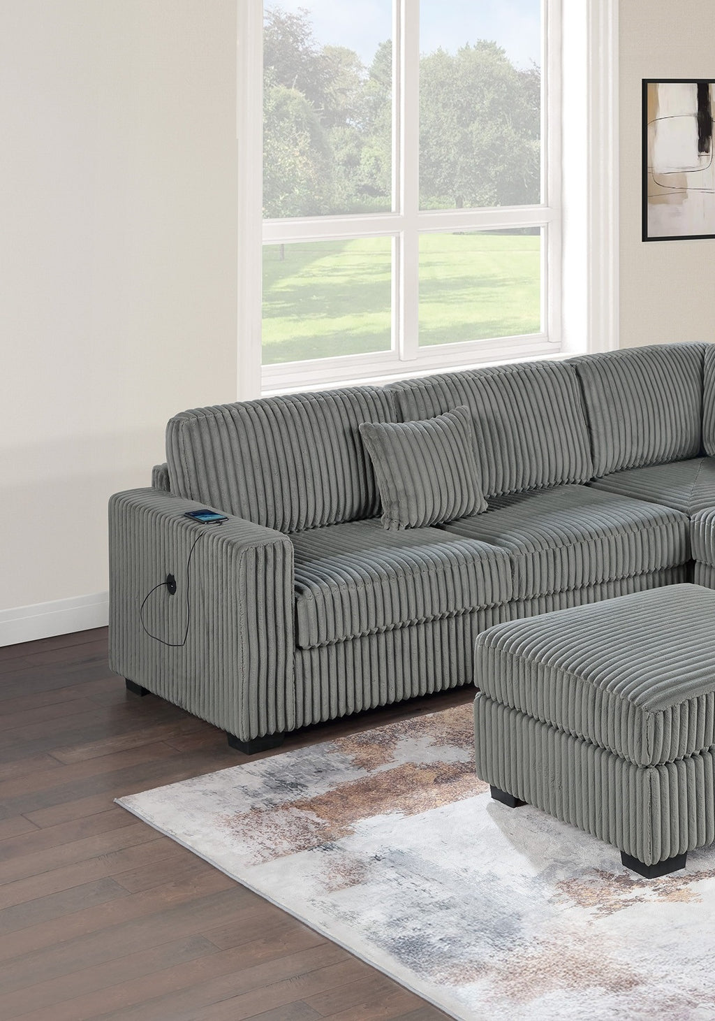 Transform your living space into a haven of comfort and style with this 4-Piece Sectional Set with Ottoman, where every detail is crafted with your comfort in mind. Crafted from sumptuous fur-like corduroy, this sectional is as soft to the touch as it is visually appealing. The set features a Right-Arm Facing (RAF) and Left-Arm Facing (LAF) One-Arm Loveseat, a Corner Wedge seamlessly connecting them, forming an inviting L-shaped configuration. Completing the ensemble is a versatile Ottoman, perfect for resting weary feet or providing additional seating. Designed for modern living, this sectional set incorporates thoughtful details such as built-in USB ports in the arms for convenient charging of devices. Plush back cushions and square arms ensure ample support and comfort, whether you're lounging or entertaining guests. Two coordinating throw pillows add a touch of elegance and complete the ensemble. With its low square legs providing a stable base, this sectional comfortably seats between 4 to 5 people, making it ideal for both intimate gatherings and family movie nights. Whether placed in a cozy den or spacious living room, this sectional set effortlessly combines functionality with sophisticated design, promising years of enjoyment and relaxation.