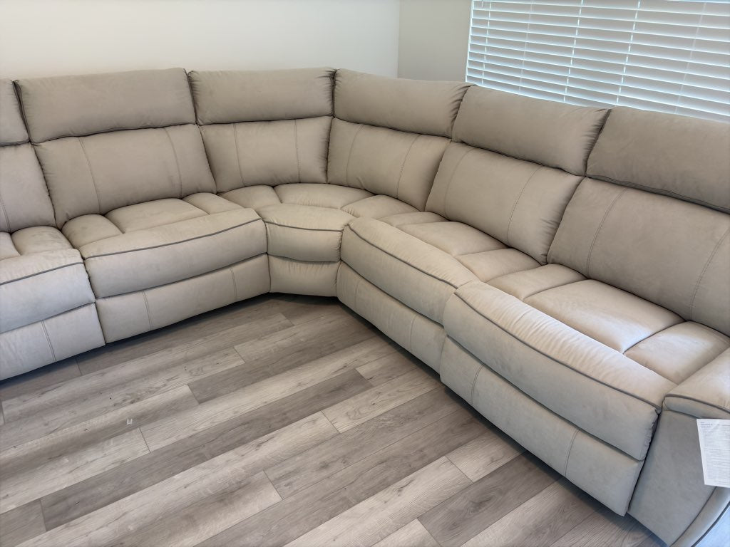 Smart, clean and ultra modern, this power reclining sectional is utterly in vogue. You'll love its indulgent cushions and contemporary bustle back styling. The sumptuous fabric, accentuated with contrasting welting, easily blends with your decor. And with reclining at the press of a button, this modular sectional proves chic design and superb comfort go hand in hand.