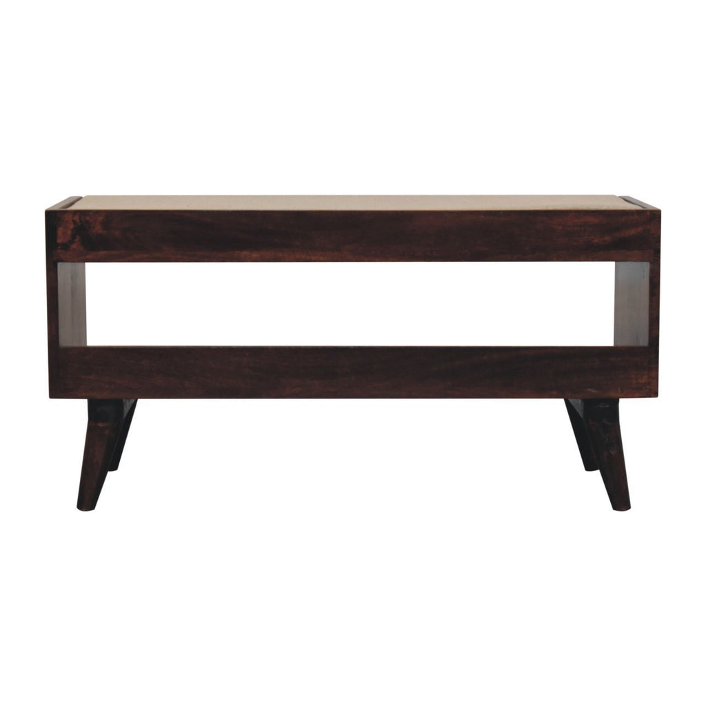 - This bench has been beautifully made from 100% solid mango wood in a california walnut finish. This bench provides comfort ability with a comfy seat pad upholstered from mud linen tweed and can be used in a variety of settings such as the bedroom, hallway or living room.