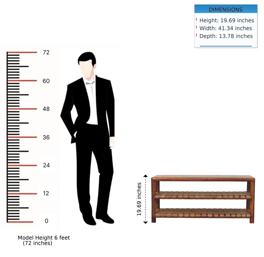 - Introducing the Braided Shoe Rack, where timeless design meets everyday functionality. Crafted from 100% solid mango wood in a rich Chestnut finish, this piece features three open shelves with two slots made with intricately braided leather, adding a unique texture and rustic elegance. Perfect for organizing shoes, accessories, or household essentials, its sturdy frame ensures lasting durability.