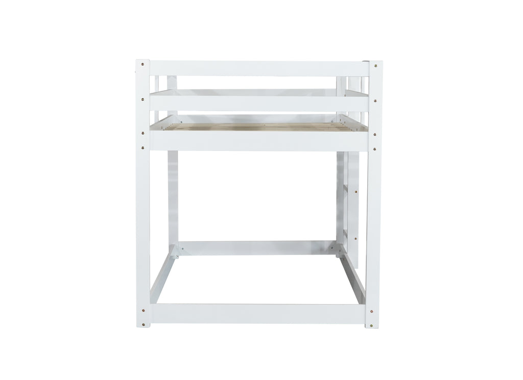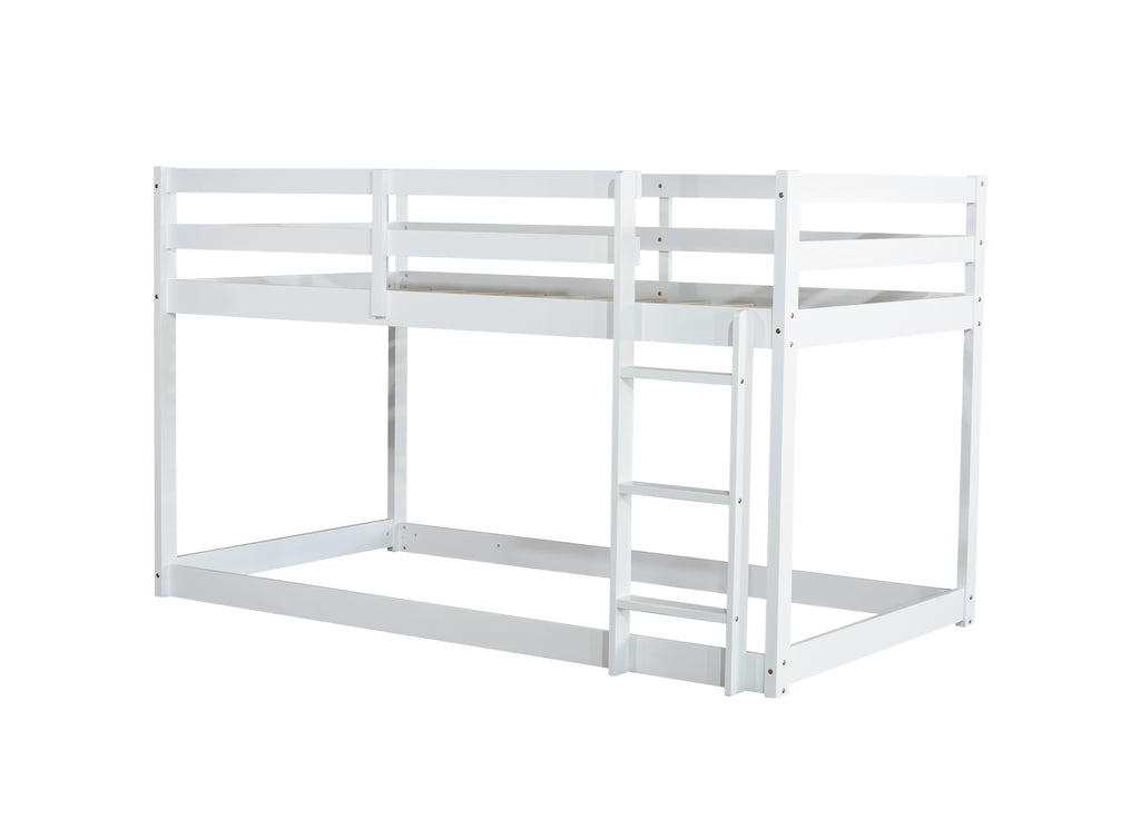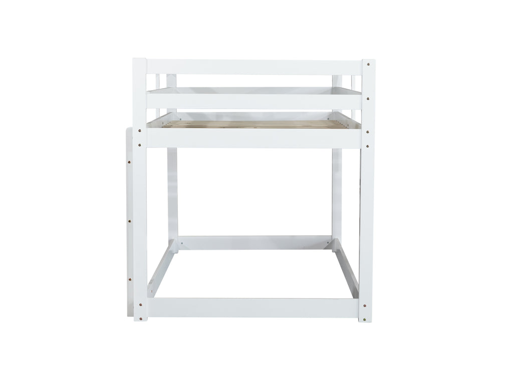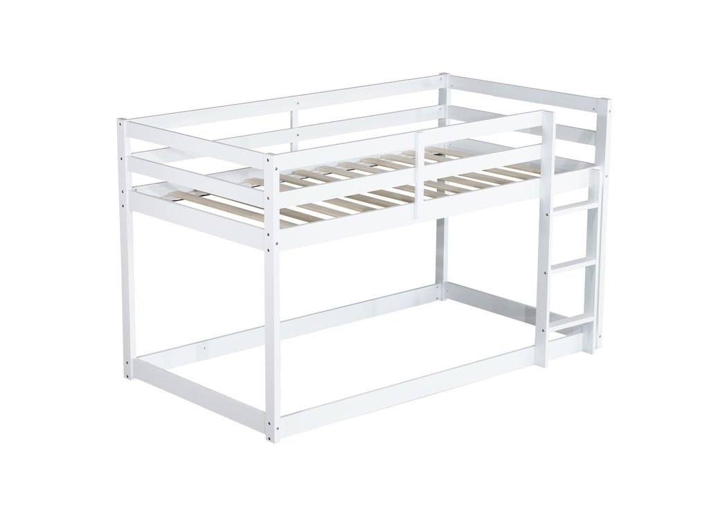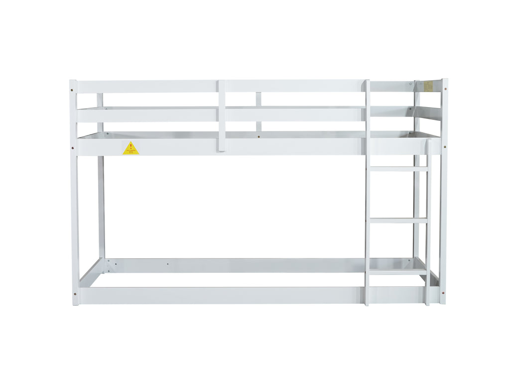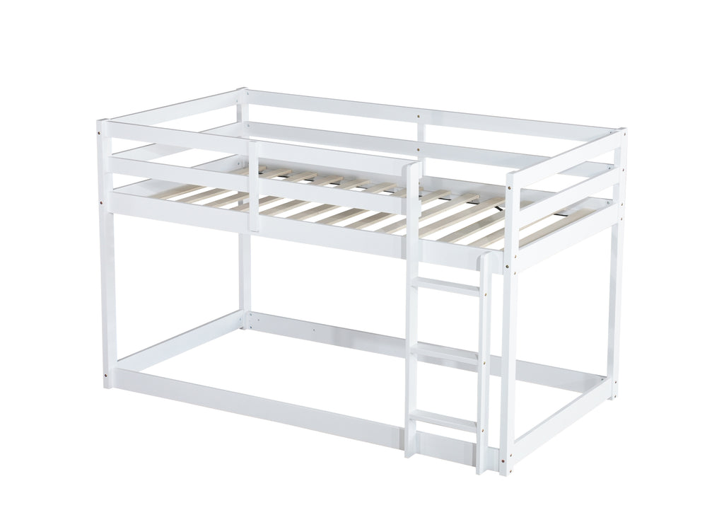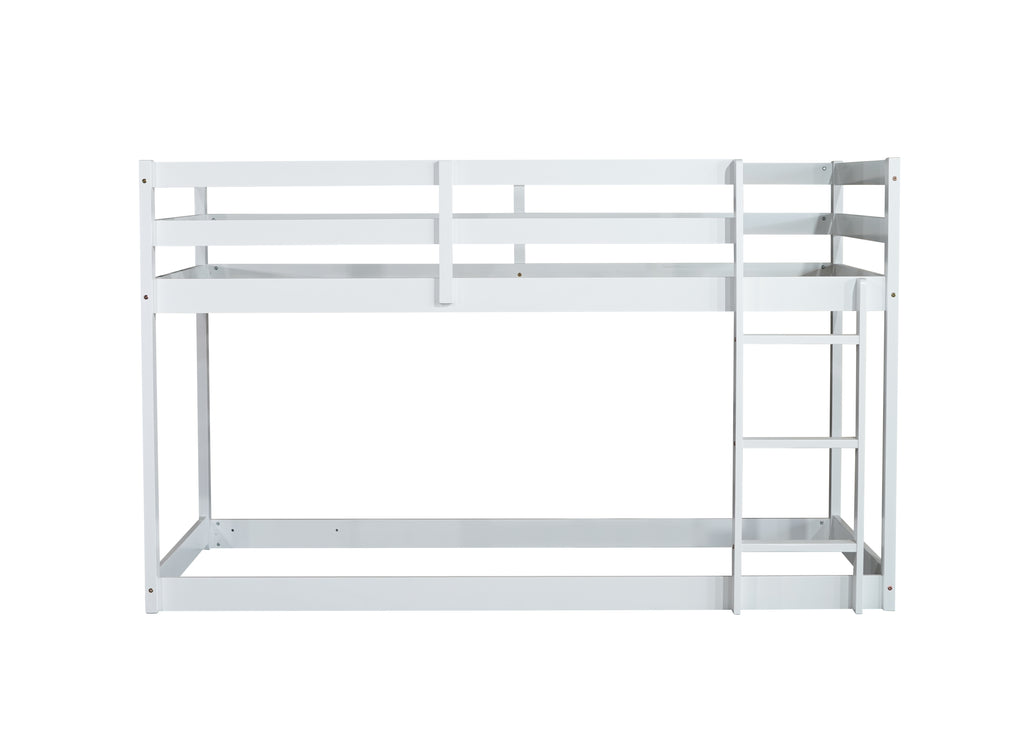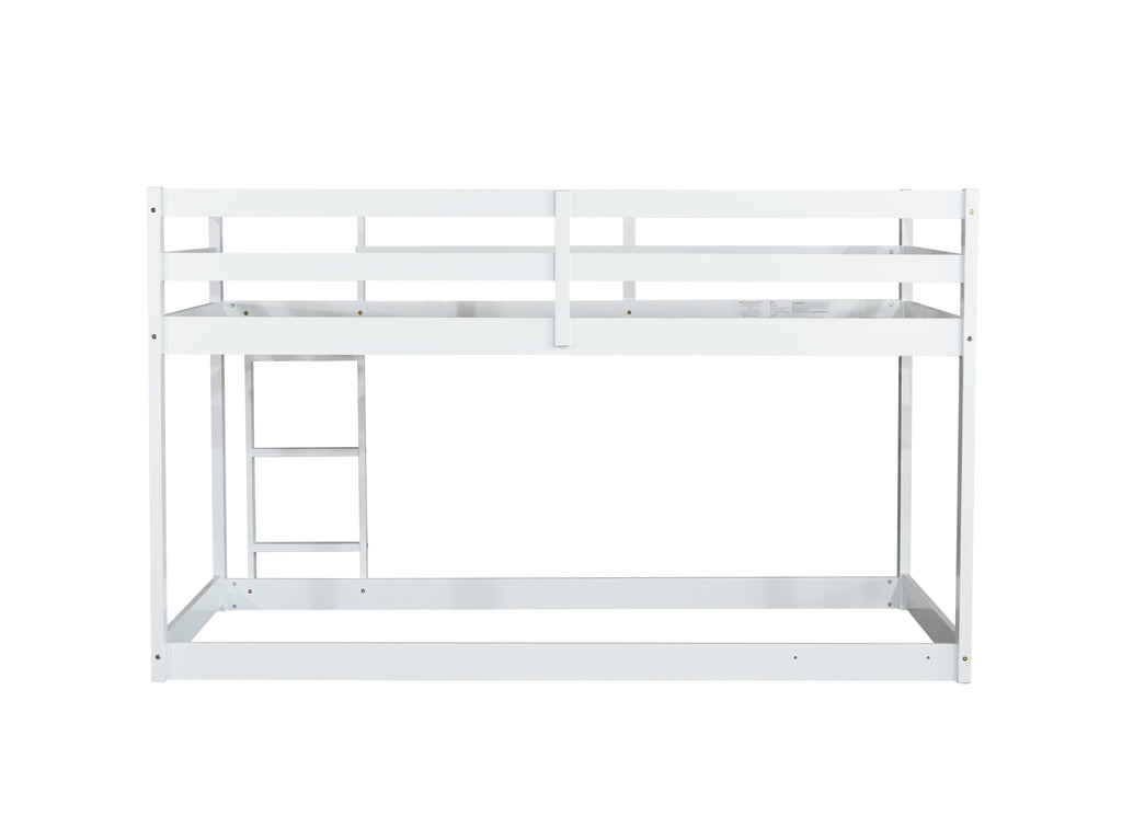 - #1 [Twin over twin bed Design]The low height feature of this twin over twin floor bunk bed not only ensures better stability but also increases versatile utilization. The unique design offers diverse sleeping preference as well as optimizing storage space. The ladder is crafted with a wider width to provide more spacious steps and solid support, ensures a more convenient climbing up and down.
