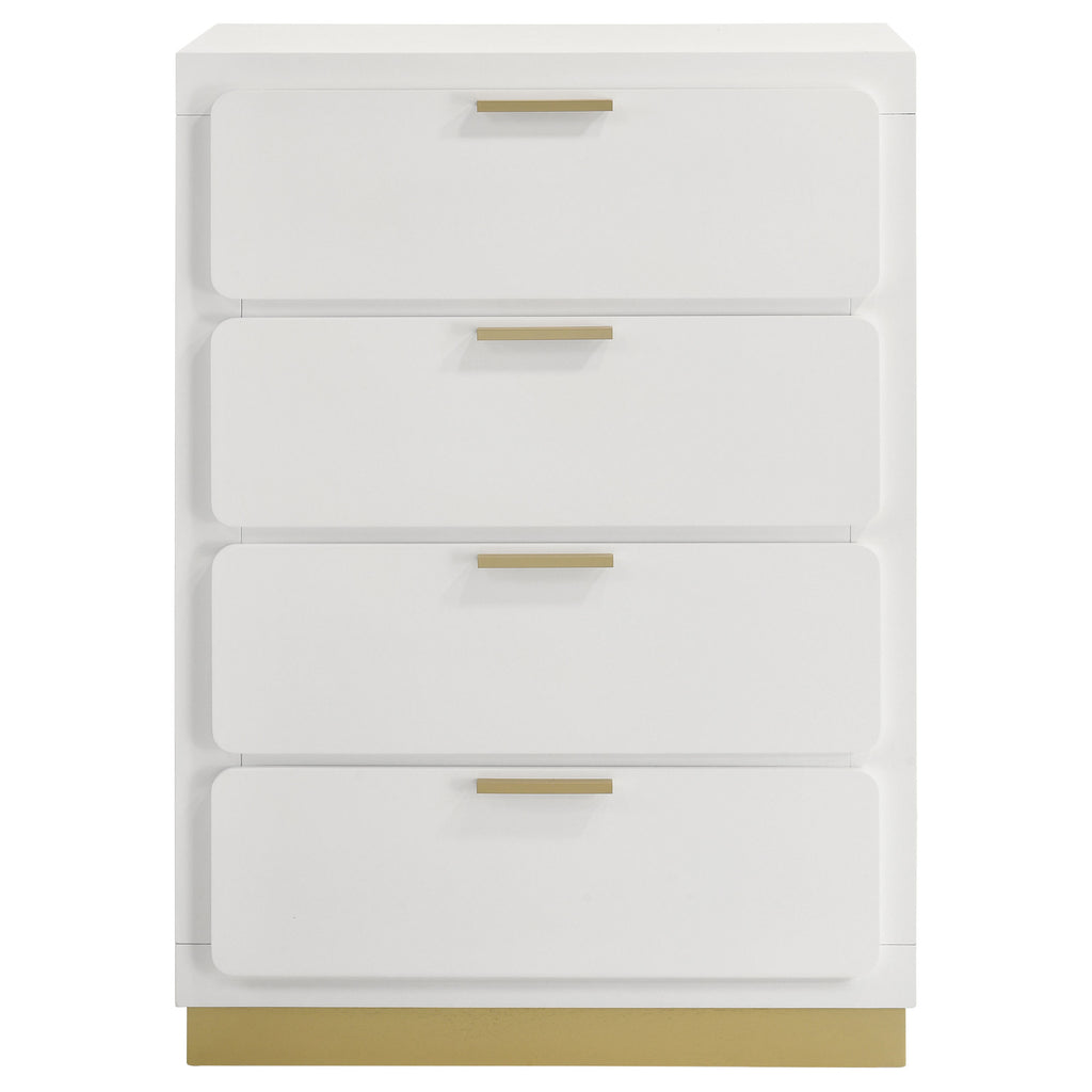 Rife with warm sophistication, this modern four-drawer chest is the perfect combination of elegance and functionality, offering roomy storage for clothing, linens, and beyond. It's decorated with gold details on the base and matching bar pulls on drawer fronts that showcase rounded corners for a touch of vintage aesthetics.