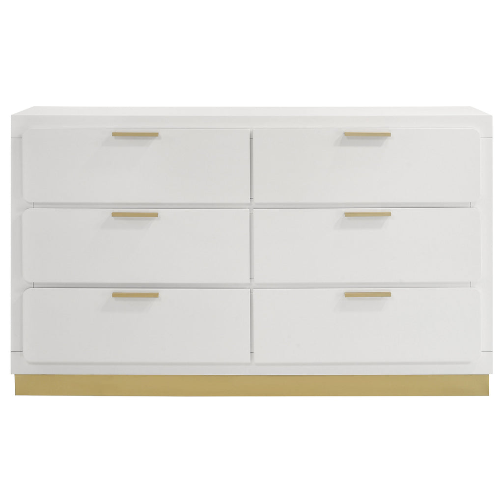 Rounded drawer fronts add the perfect hint of mid-century character to the rich two-tone finish of this modern six-drawer dresser. Offering impressive storage in your bedroom, the dresser includes a gold finish base and long bar pulls, offering a wash of warm sophistication that's sure to enchant the surrounding decor.