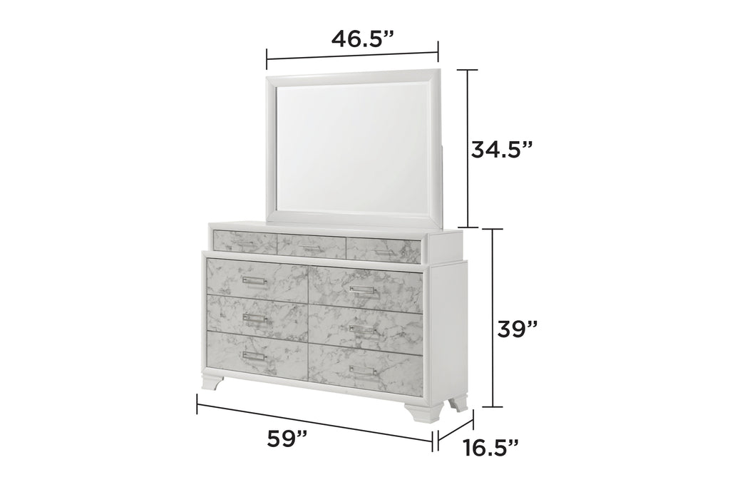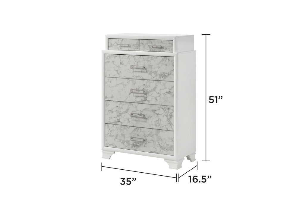Elevate your bedroom to a realm of refined elegance and style with this luxurious bedroom set, seamlessly blending contemporary design with classic touches. Each piece is crafted from high-quality manufactured wood with a pristine white finish, complemented by marble-patterned accents that add a sophisticated air. The set includes a stylish bed featuring built-in lighting, USB-C ports, and Bluetooth speakers for an enriched audio experience. Accompanying the bed is a spacious dresser with ample storage, a sleek mirror to enhance natural light, and a versatile nightstand perfect for keeping essentials within reach. The 5-piece configuration includes an additional chest, offering even more storage possibilities without compromising on style.