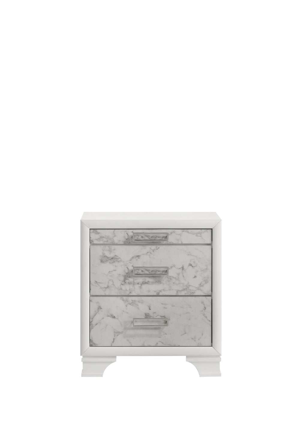 Elevate your bedroom to a realm of refined elegance and style with this luxurious bedroom set, seamlessly blending contemporary design with classic touches. Each piece is crafted from high-quality manufactured wood with a pristine white finish, complemented by marble-patterned accents that add a sophisticated air. The set includes a stylish bed featuring built-in lighting, USB-C ports, and Bluetooth speakers for an enriched audio experience. Accompanying the bed is a spacious dresser with ample storage, a sleek mirror to enhance natural light, and a versatile nightstand perfect for keeping essentials within reach. The 5-piece configuration includes an additional chest, offering even more storage possibilities without compromising on style.