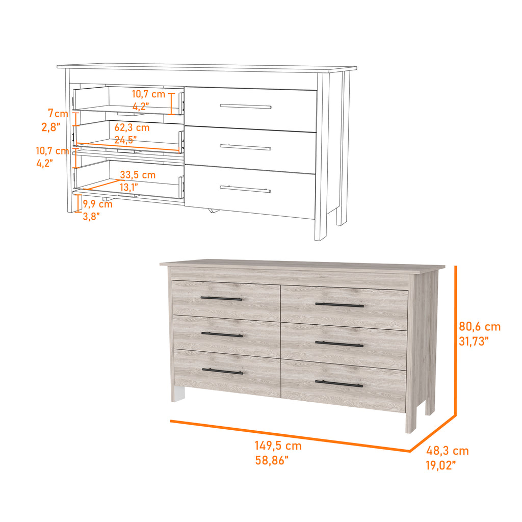 The black metal pulls add a sleek, modern touch, contrasting strikingly with the drawer finish while ensuring durability and ease of use. Featuring six spacious drawers, this piece offers ample storage for clothing and essentials, with a light gray finish that blends seamlessly with various décor styles and a classic rectangular shape that provides a versatile, streamlined storage solution.