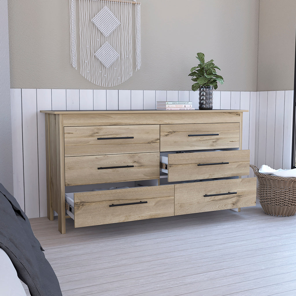 The black metal pulls add a sleek, modern touch, contrasting with the drawer finish and ensuring durability and ease of use. With six spacious drawers for organized storage and a light oak and white combination that offers a bright, contemporary look, this rectangular piece provides a versatile and streamlined storage solution that fits well in various spaces.