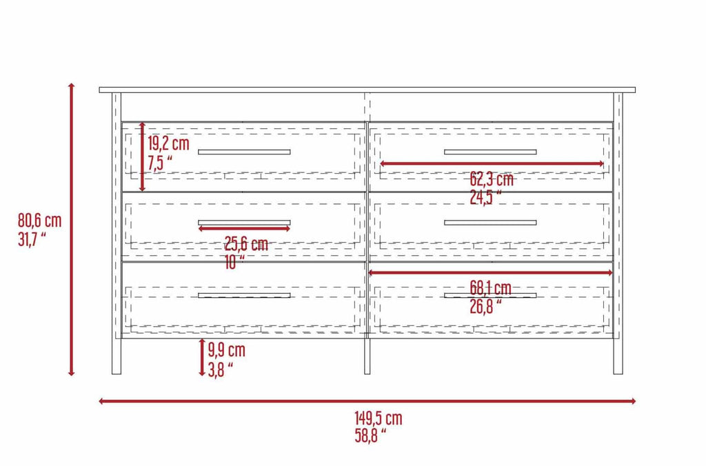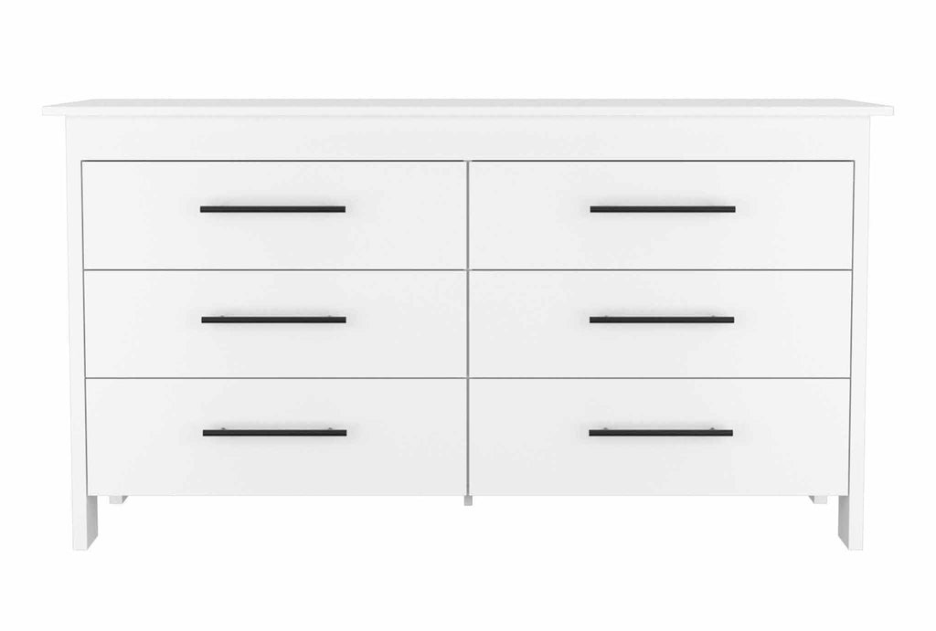 The black metal pulls add a sleek, modern touch, creating a striking contrast against the white finish while ensuring durability and ease of use. With six spacious drawers for organized storage and a clean, bright look, this rectangular piece offers a versatile and streamlined design that complements various interior styles and enhances any room.