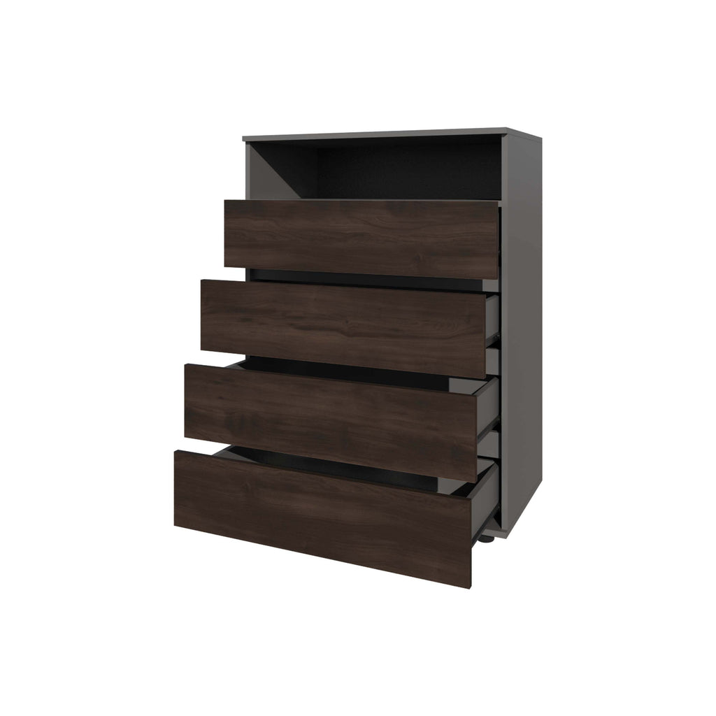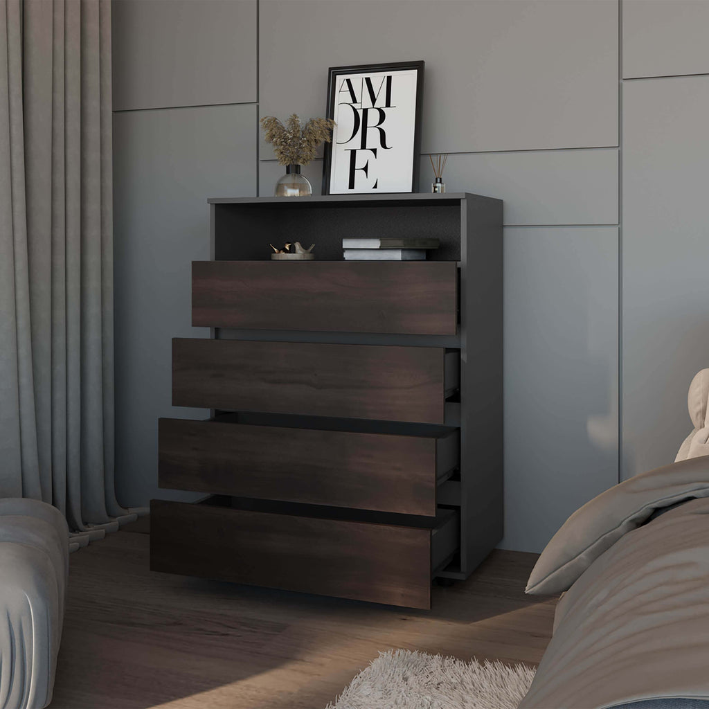 This dresser features an elegant two-tone finish in matte grey and stained walnut, combining modern style with a warm, inviting look. With four spacious drawers and an open shelf, it provides ample storage and convenient display space within a clean, rectangular design that complements a variety of contemporary bedroom interiors.