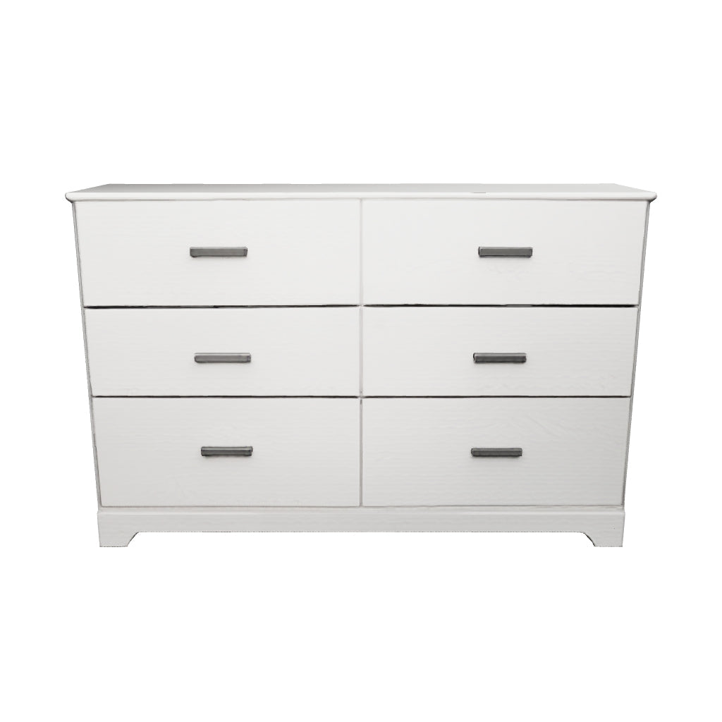 With its clean-lined look and modern attitude, this dresser is a fresh style awakening. A crisp, white hue over subtle replicated wood grain easily complements other furniture finishes. Smooth drawer fronts with antiqued pewter-tone handles complete the aesthetic.