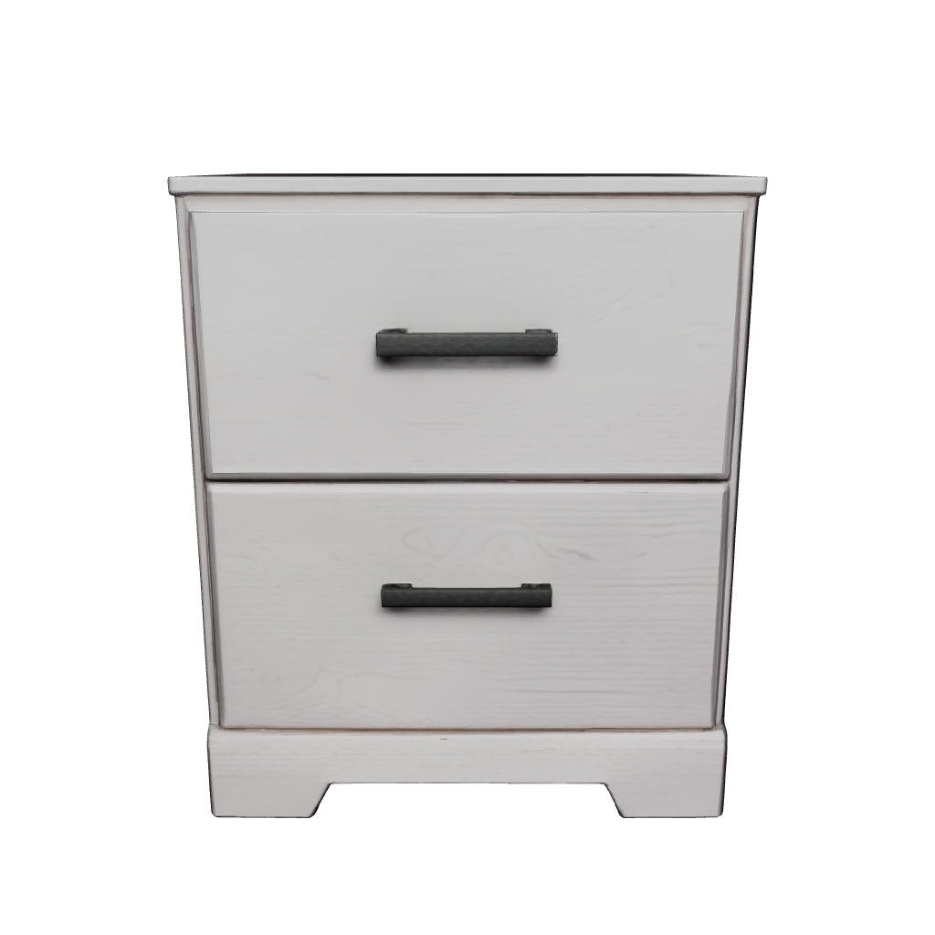With its clean-lined look and modern attitude, this nightstand is a fresh style awakening. A crisp, white hue over subtle replicated wood grain easily complements other furniture finishes. Smooth drawer fronts with antiqued pewter-tone handles complete the aesthetic.