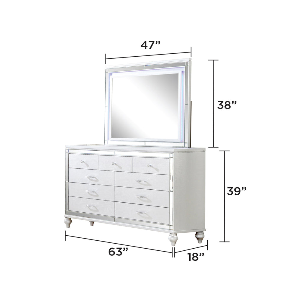 Elevate your bedroom to the pinnacle of luxury with the Glamour Elegance Bedroom Sets. These sets encompass the exquisite Glamour Elegance Bed as the focal point, alongside the functional Nightstand adorned with mirror accents and an LED-lit mirror. The spacious Dresser, featuring diamond drawer pulls and a sleek gold-finished wood top, provides ample storage. Completing the ensemble is the elegant Mirror, boasting intricate framing and embedded LED lights. For those seeking extra storage space without compromising on style, the 5PC Set includes the Chest. Each piece in these collections is thoughtfully designed to harmoniously complement the others, creating a complete bedroom ensemble that radiates sophistication. Crafted to perfection, these sets effortlessly balance style and practicality, offering generous storage while transforming your bedroom into a sanctuary of refined luxury.