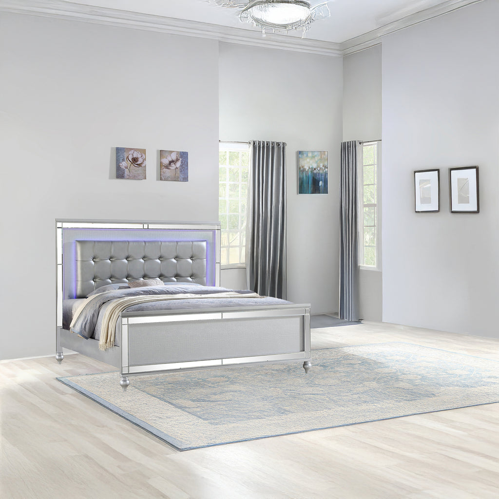 Redesign your home with this Glamorous, refined collection, which features a Mirror Front and framing that will give your space a sophisticated air. Add more color to your room with this bed. The classy look of the bed adds a balance of modern and exquisite style. Elaborated detailing for this Bed will surely bring true splendor into your home. The Bed with Silver finish wood is ultra-contemporary in design and scale and will add modern flair to your bedroom. This exceptionally beautiful Bed features crystal tufted upholstery on the headboard. The headboard includes an LED light that will improve the ambiance of your bedroom. Add glam to any bedroom with this top-selling design. Indulge in the exquisite details while awake and in restful sleep at the end of each day.