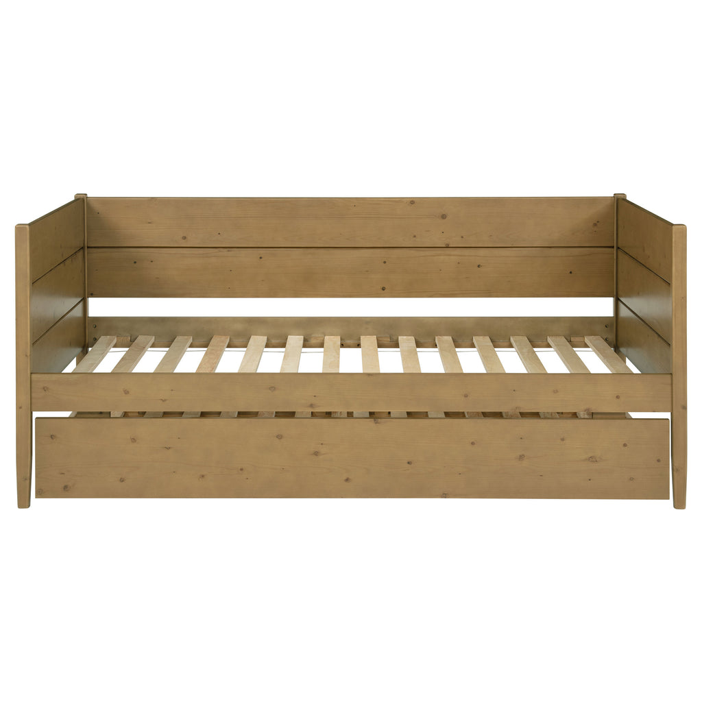 - Transitional-style daybed with trundle features a warm natural brown finish that enhances rustic charm and timeless appeal
