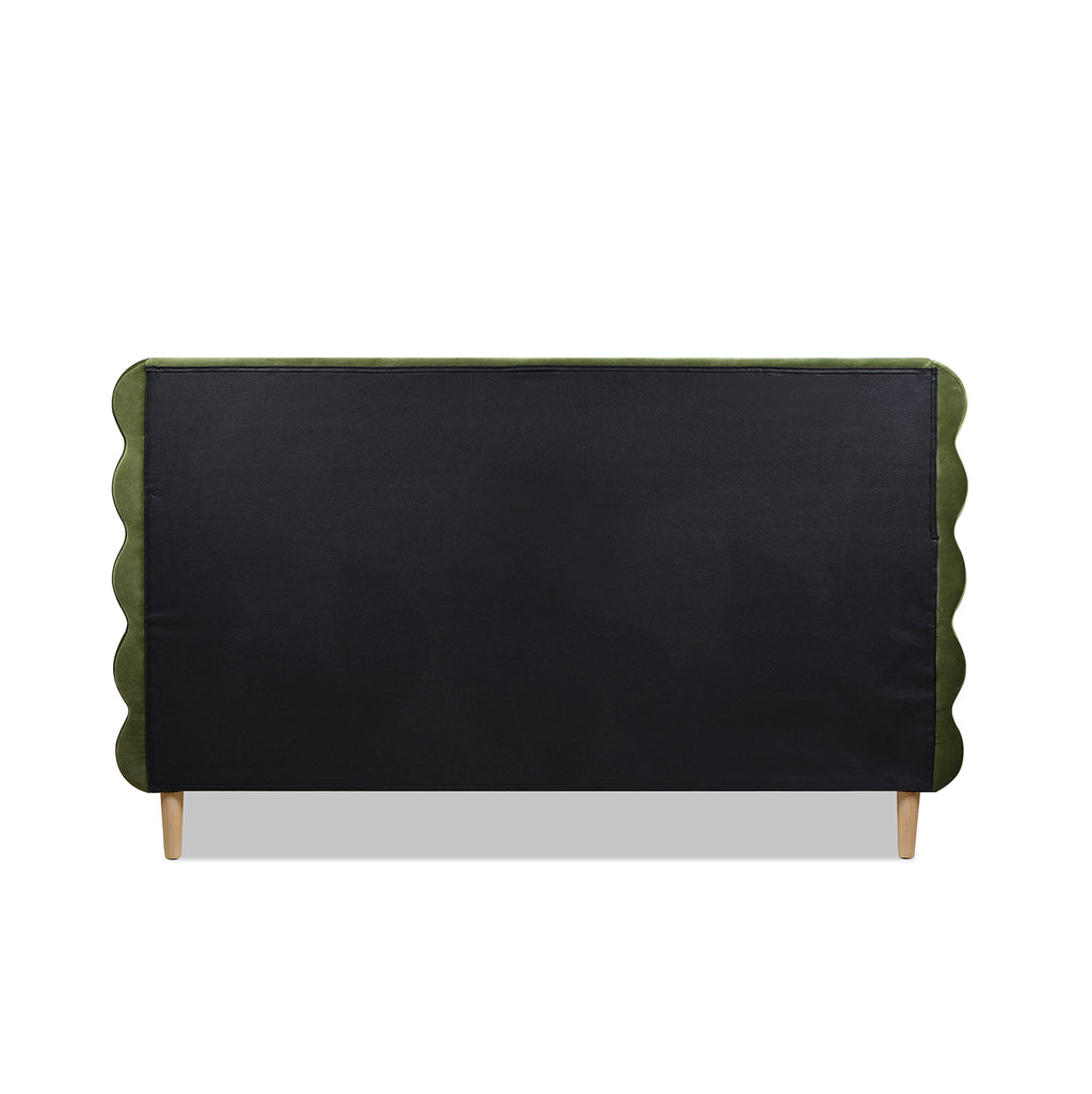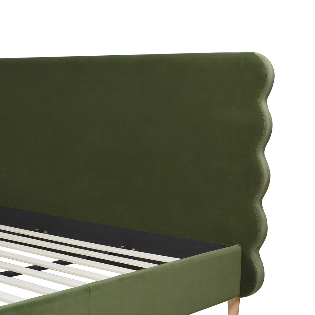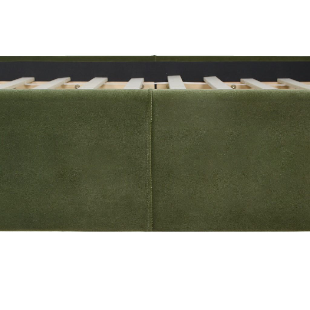 - Fully upholstered bed frame including headboard, side rails, and platform supports