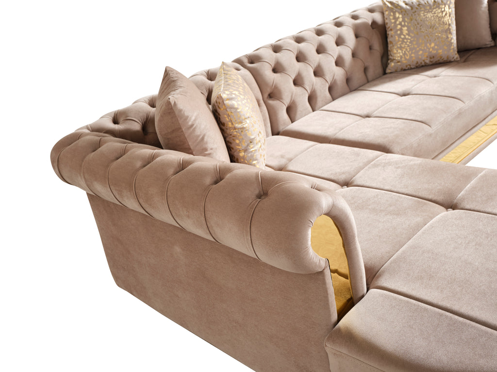 The perfect mix of Taupe velvet and gold stainless steel comes to life in your space with this immaculate L-shaped living room set. This bold sofa comes upholstered in rich, sumptuous-to-the-touch velvet to make a fashionable statement in your space. The curved button tufted back design lends it a modish touch, and the gold stainless steel trim around its arms and base adds to its glitzy appeal. This one-of-a-kind living room sectional has a quilted back and seat detail made with a luxuriously padded fabric. The matching four accent pillows are included as pictured for this set. This living room piece has matching color spindle wood legs that complement the entire design. The armrests are brimmed with layers of high-density cushioning. The hardwood frame in this furniture piece will last you for years. Uncluttered and endlessly inviting, this piece offers a clean design and tempting cushions. This living room collection embodies the fundamental elements of modern design and effortlessly adds sleekness to any space.
