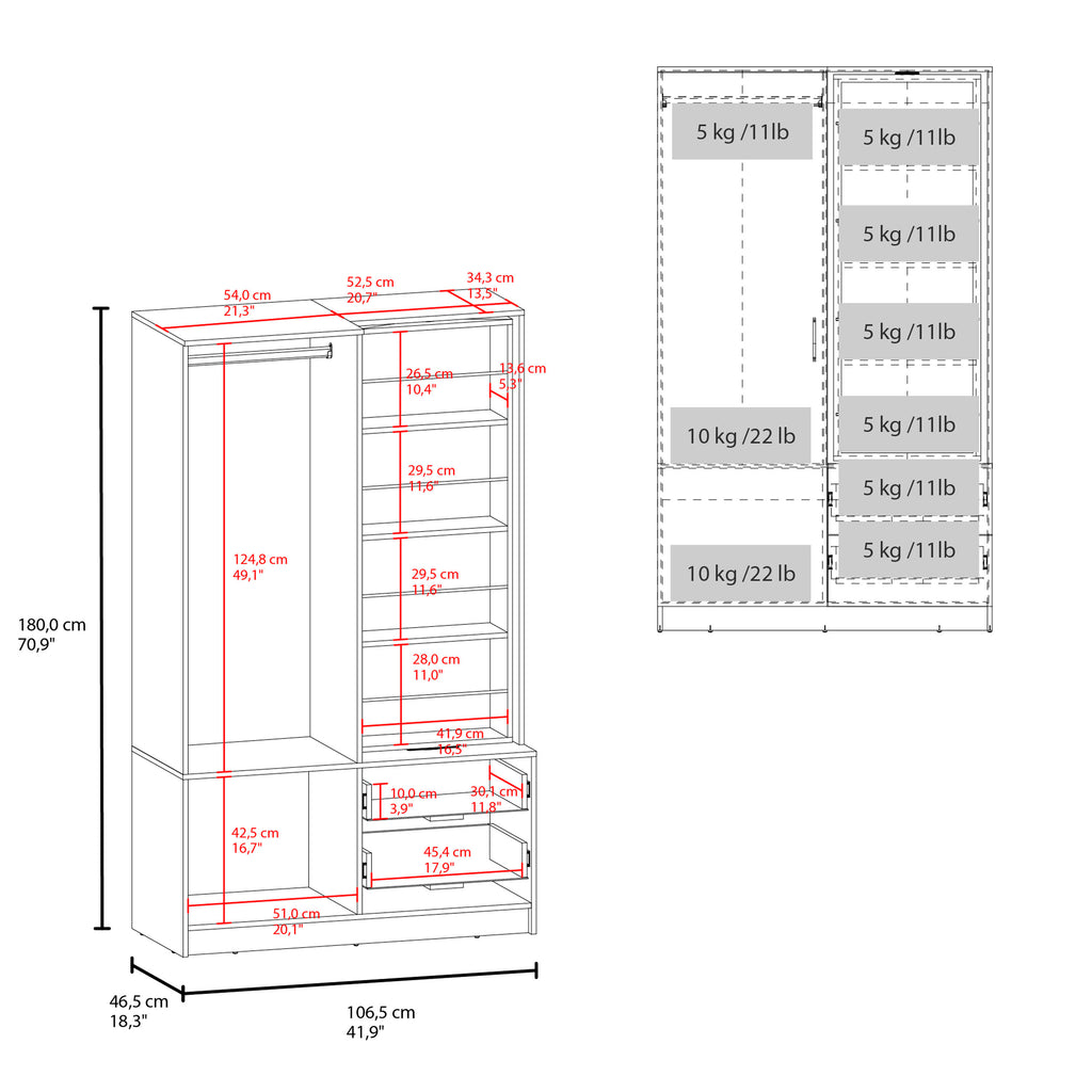'This versatile storage solution brings thoughtful organization and modern flair to any room. Four shelves neatly showcase footwear and accessories, while a sturdy hanging rod keeps garments wrinkle-free and within easy reach. Below, two smooth-glide drawers provide hidden space for folded clothing or linens, and open cubbies at the base are perfect for baskets, bags, or decorative accents.