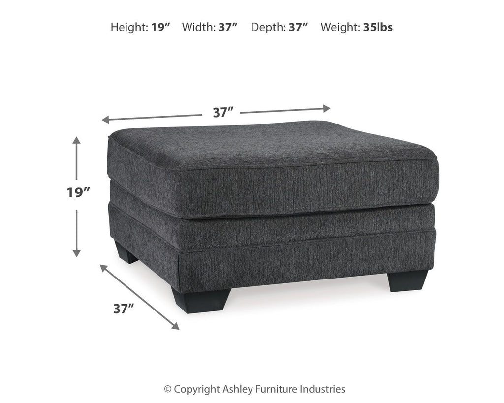 The ultimate sectional centerpiece, this oversized ottoman is big on cool, contemporary style and long on comfort. Plushly upholstered in a slate gray fabric, this ottoman is so generously scaled, you can top it with a serving tray and still have plenty of room to kick up your heels.