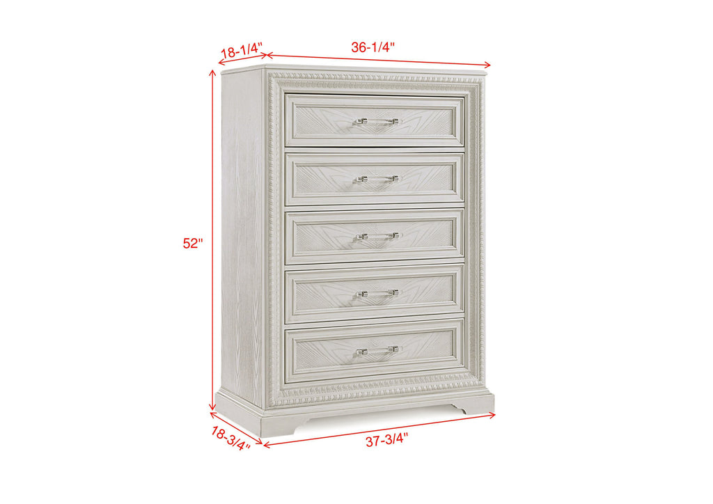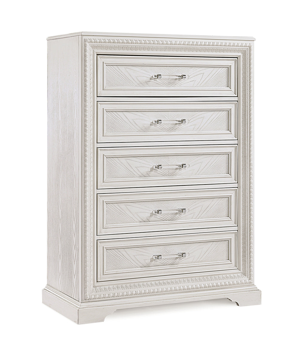 Description:- Introducing a bedroom collection that brings a breath of fresh sophistication to any living space. This suite boasts a bright, antique white finish that immediately brightens and opens up a room, providing a versatile foundation for any decor style. Storage needs are gracefully met by the nightstand, accented with refined drawer pulls that offer a subtle contrast and easy access