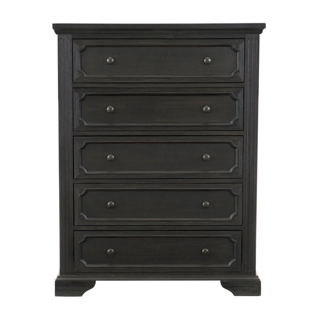 Rustic styling intersects with traditional lines in the design of the Bolingbrook Collection. The charcoal finish over pine solids and engineered pine veneer creates a warm complement to the elegantly framed chest. Knob hardware subtly accents the drawer fronts.