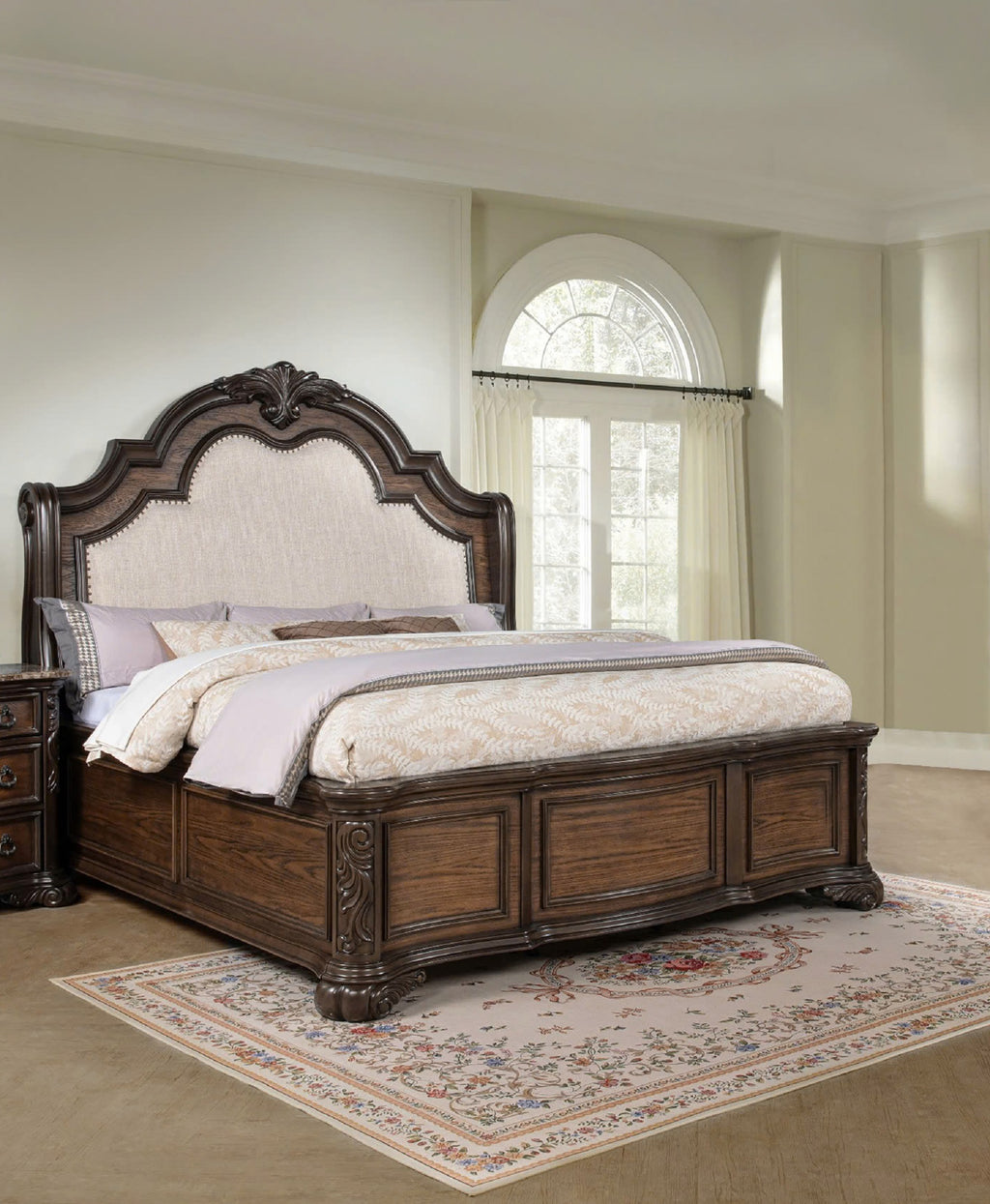 Experience timeless elegance with this Traditional Queen Panel Bed, featuring luxurious fabric upholstery and exquisite tufted nailhead trim. Its ornate detailing and rich coffee brown finish exude a regal charm, creating a sophisticated focal point for your bedroom. This beautifully crafted bed perfectly blends classic design with unparalleled comfort, ensuring a stunning and inviting sanctuary.