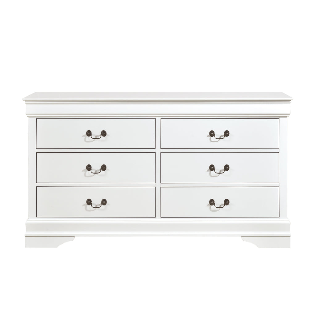 Traditional in design and modest in scale, the elegant Mayville Collection takes its design inspiration from the classic Louis Philippe styling. The Okume veneer of the dresser is paired with a white finish and is accentuated by antique brass tone drop handles.