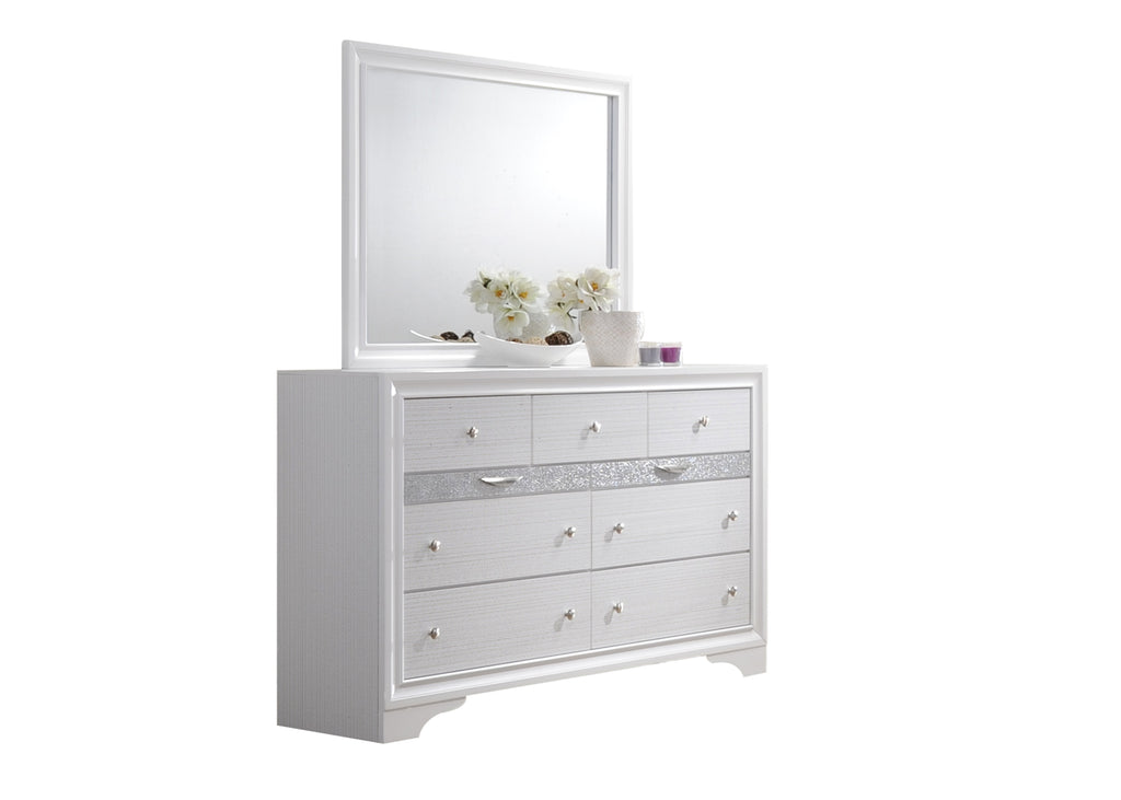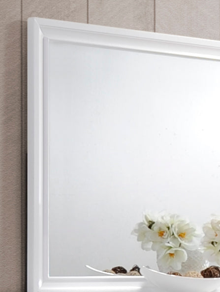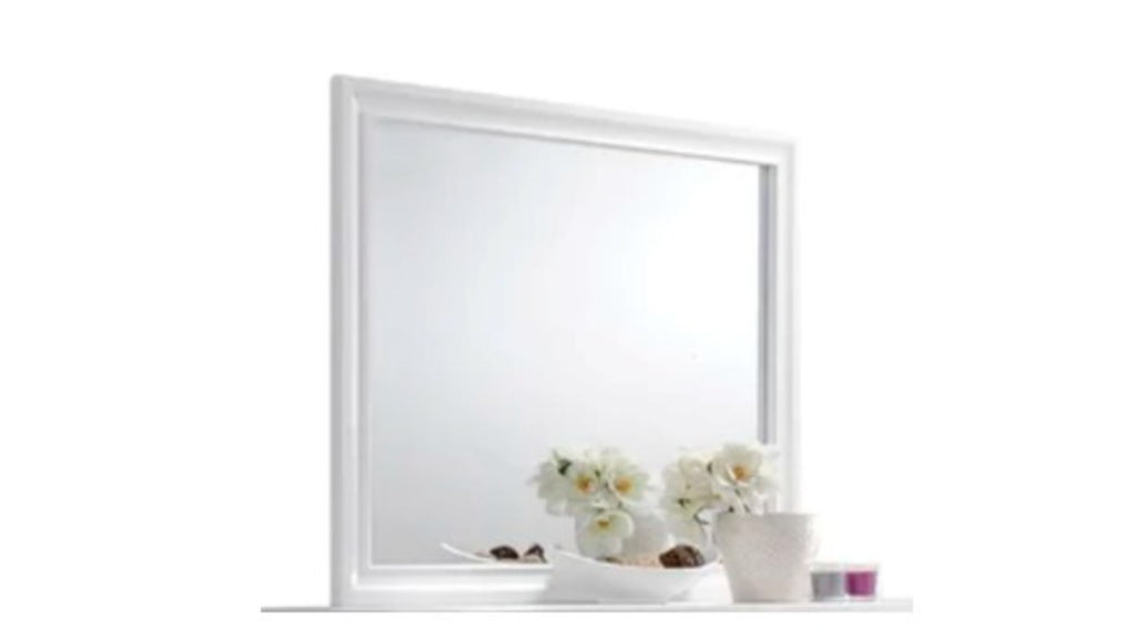 The mirror, part of this bedroom set, is crafted with a simple yet elegant design. Its clear reflection and simplistic frame make it a versatile piece for any bedroom. The mirror not only adds a sense of space to the room but also complements the dresser, creating a harmonious look.