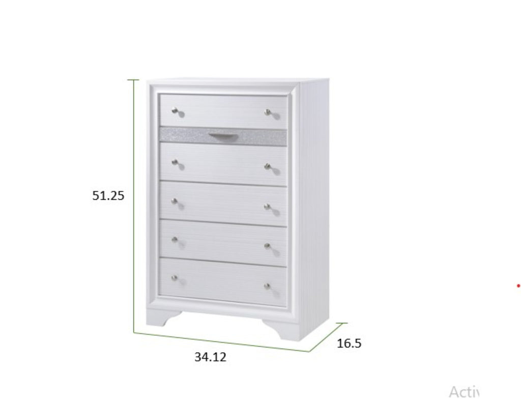 The five-drawer chest in this bedroom set is a perfect storage solution. Each drawer, adorned with silver knob pulls, offers ample space for shirts, socks, sweaters, and jeans. The smooth top surface is ideal for a charging station or a stylish lamp, enhancing its utility.