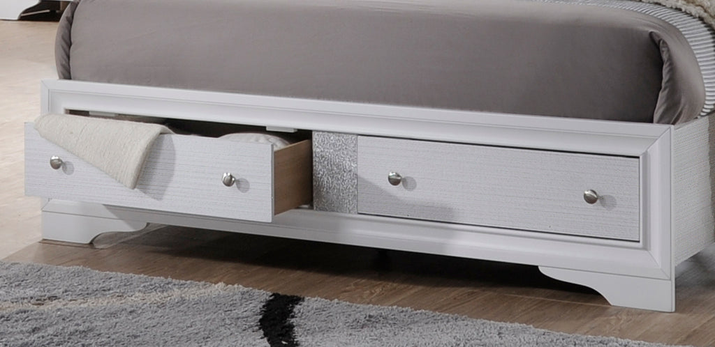 - Bed features a beautifully crafted headboard and two storage drawers.