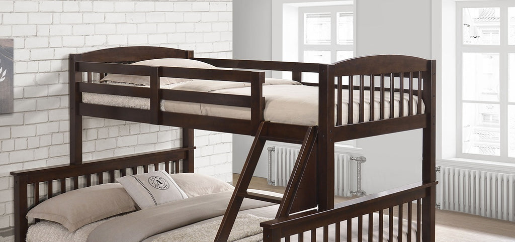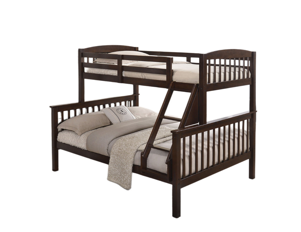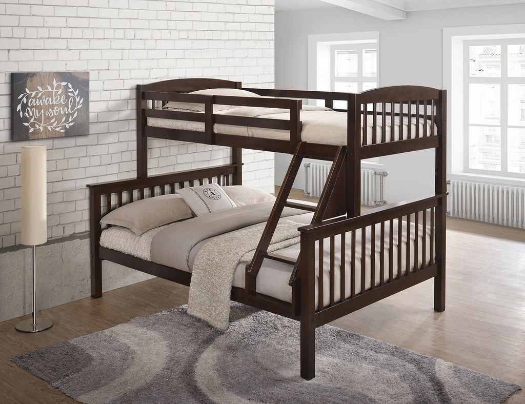 Cherry finish wood twin over twin bunk bed front access ladder. Features upper safety rails, front access angled ladder. slats each top and bottom.