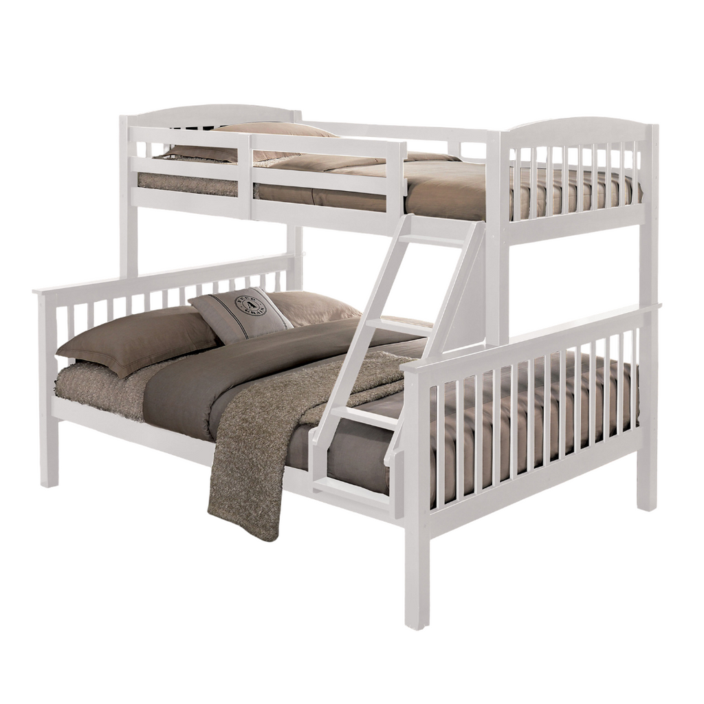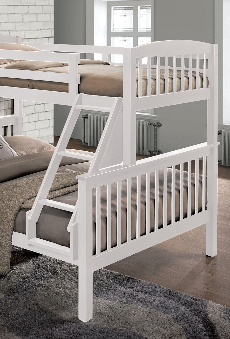 White finish wood twin over twin bunk bed front access ladder. Features upper safety rails, front access angled ladder. slats each top and bottom.
