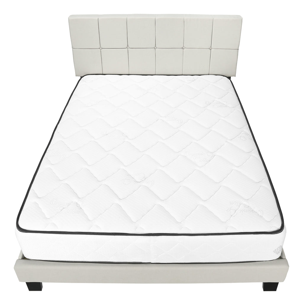 - Low profile platform queen bed frame upholstered in a beautiful beige linen-look fabric; padded headboard boasts an elegant panel button tufted design