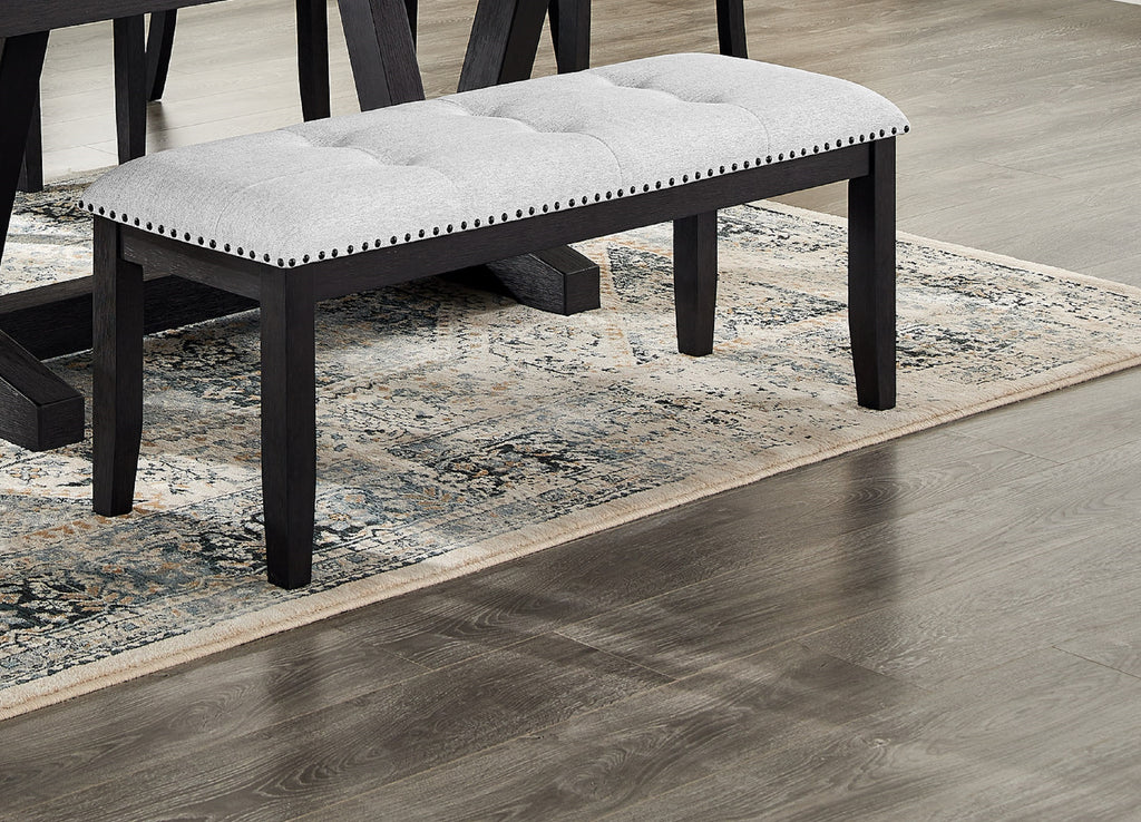 Product Description: This upholstered dining bench is the perfect blend of style and comfort. The black finish adds a touch of modern sophistication to any dining room, living space or entryway, while the soft grey upholstery offers a neutral tone that complements virtually any decor. The button-tufted seat provides a chic, refined look, while the cushioned bench offers comfortable seating for family and guests. Whether you're hosting a dinner party or simply enjoying a cup of coffee, this bench is sure to impress with its elegant yet versatile style.
