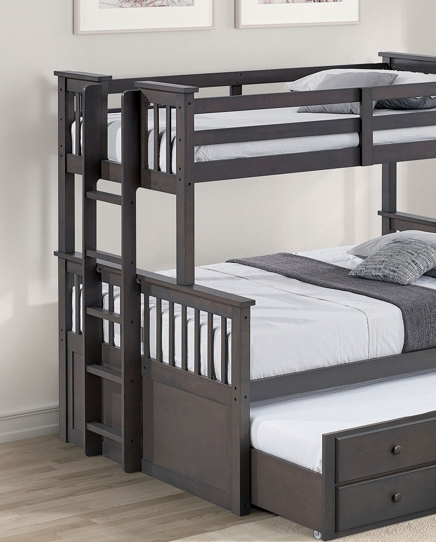 This sturdy bunk bed features side ladder for easy access to top twin, lower full bed with twin trundle and roomy drawers underneath.