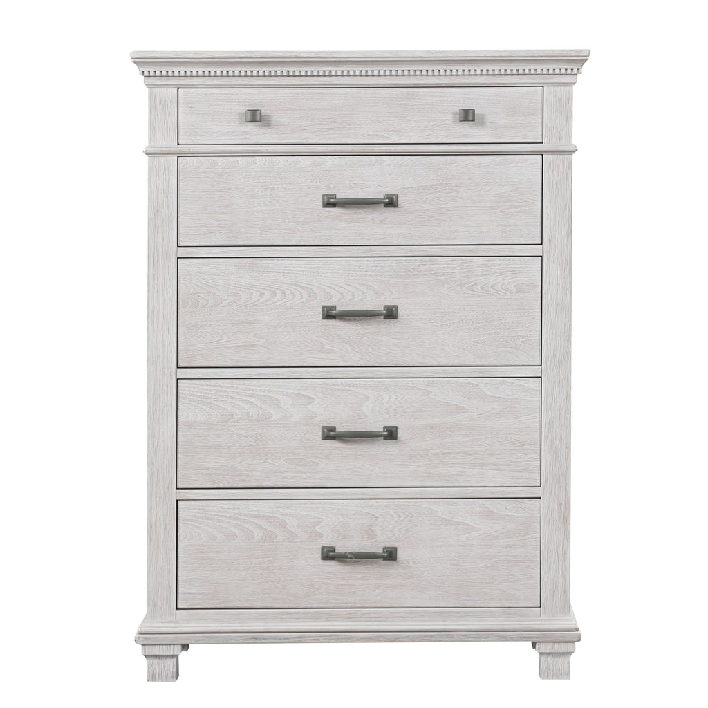 Transitional style ideal for those craving a timeless, balanced look between traditional elegance and modern simplicity. Weathered Gray adds a soft, neutral tone that complements a wide variety of decor. Includes 5 drawers, offering sample space to organize clothing, linens, or other bedroom essential.