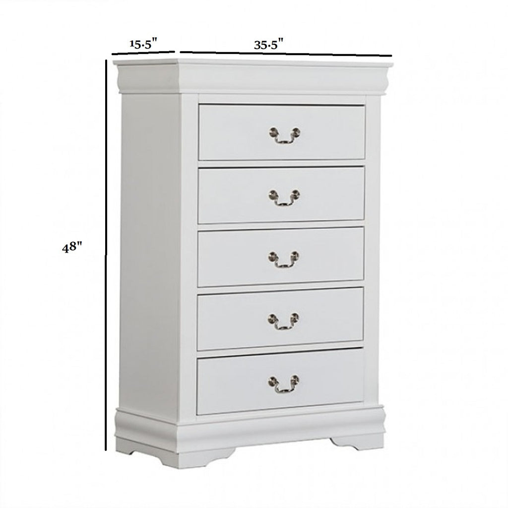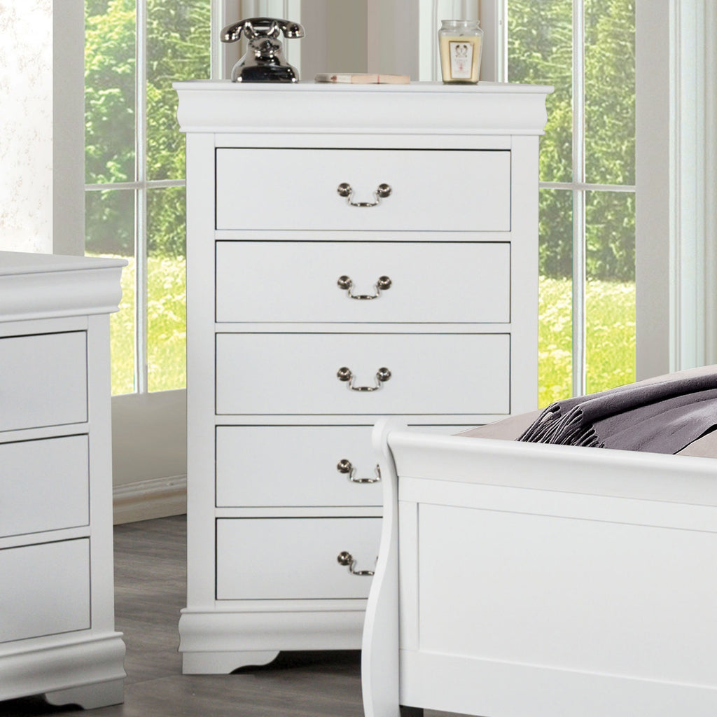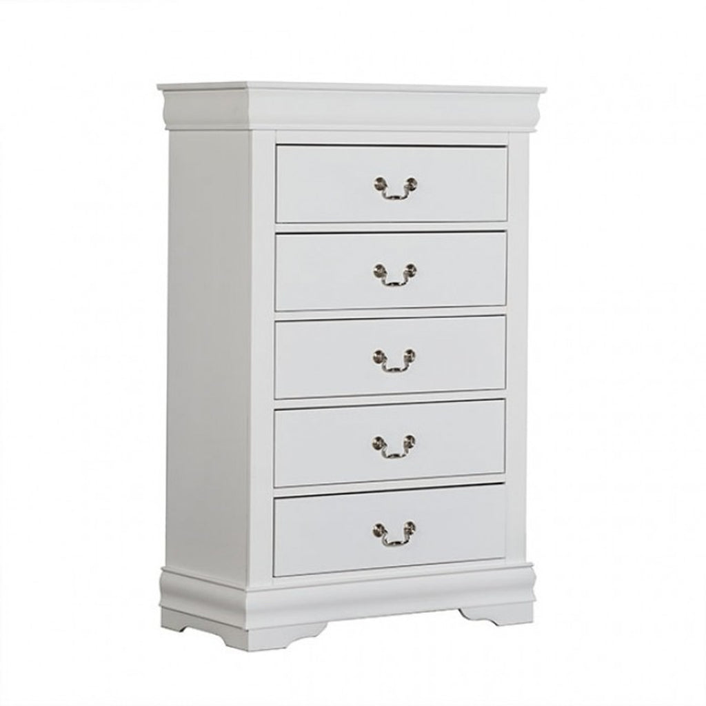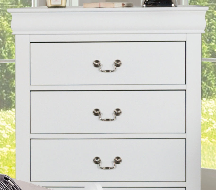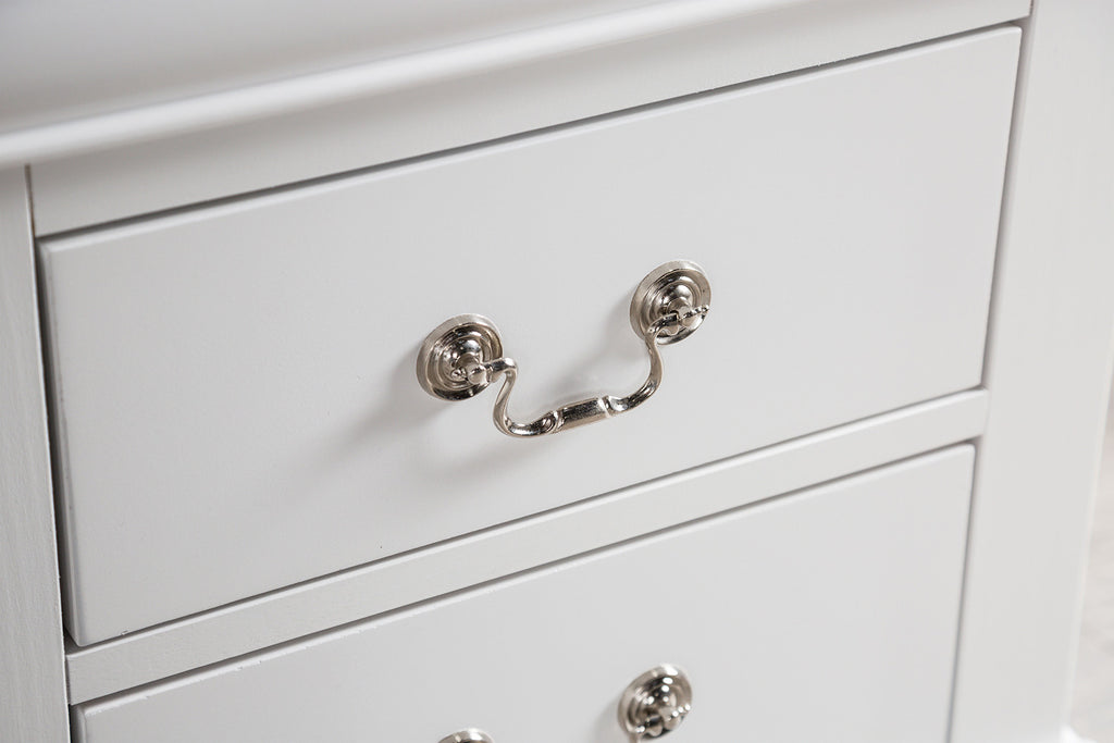 A transitional design in a crisp white finish—harmonizing traditional charm with modern appeal. Finished with nickel bail (hanging) drawer pulls and bracket feet for a refined and stable base. Features English dovetail joinery and dust-proof cases, ensuring longevity and smooth operation.